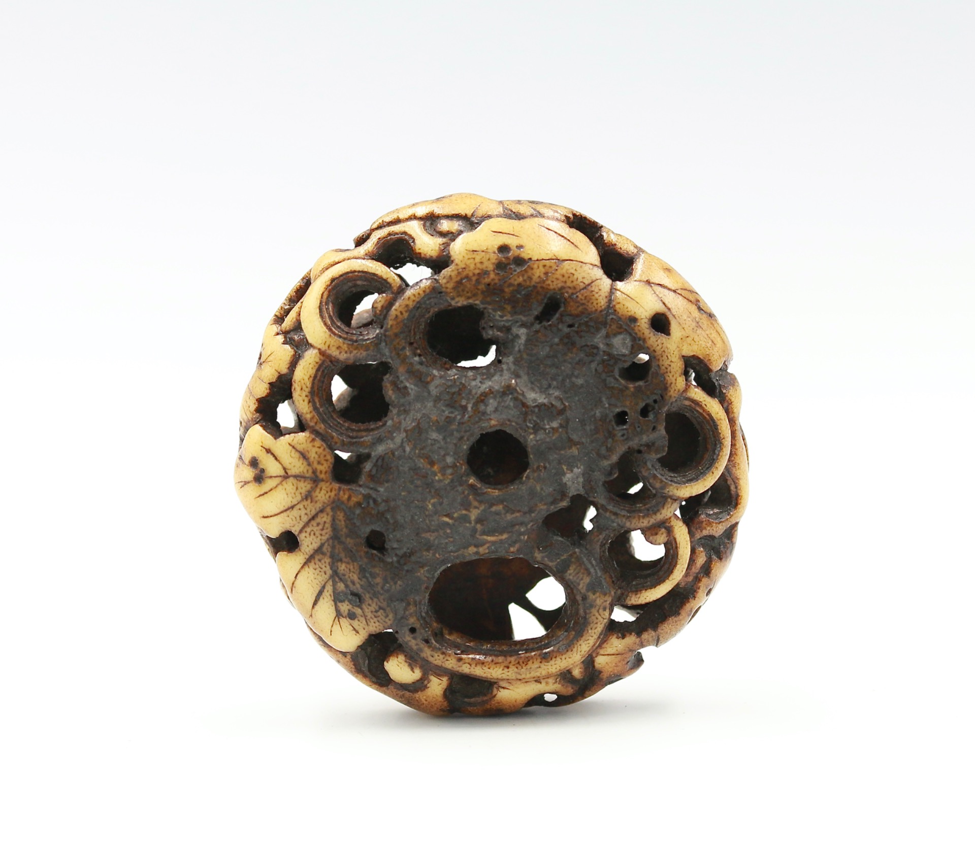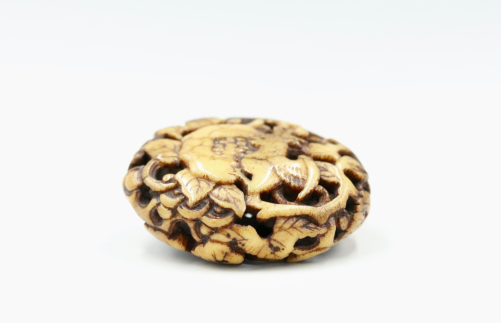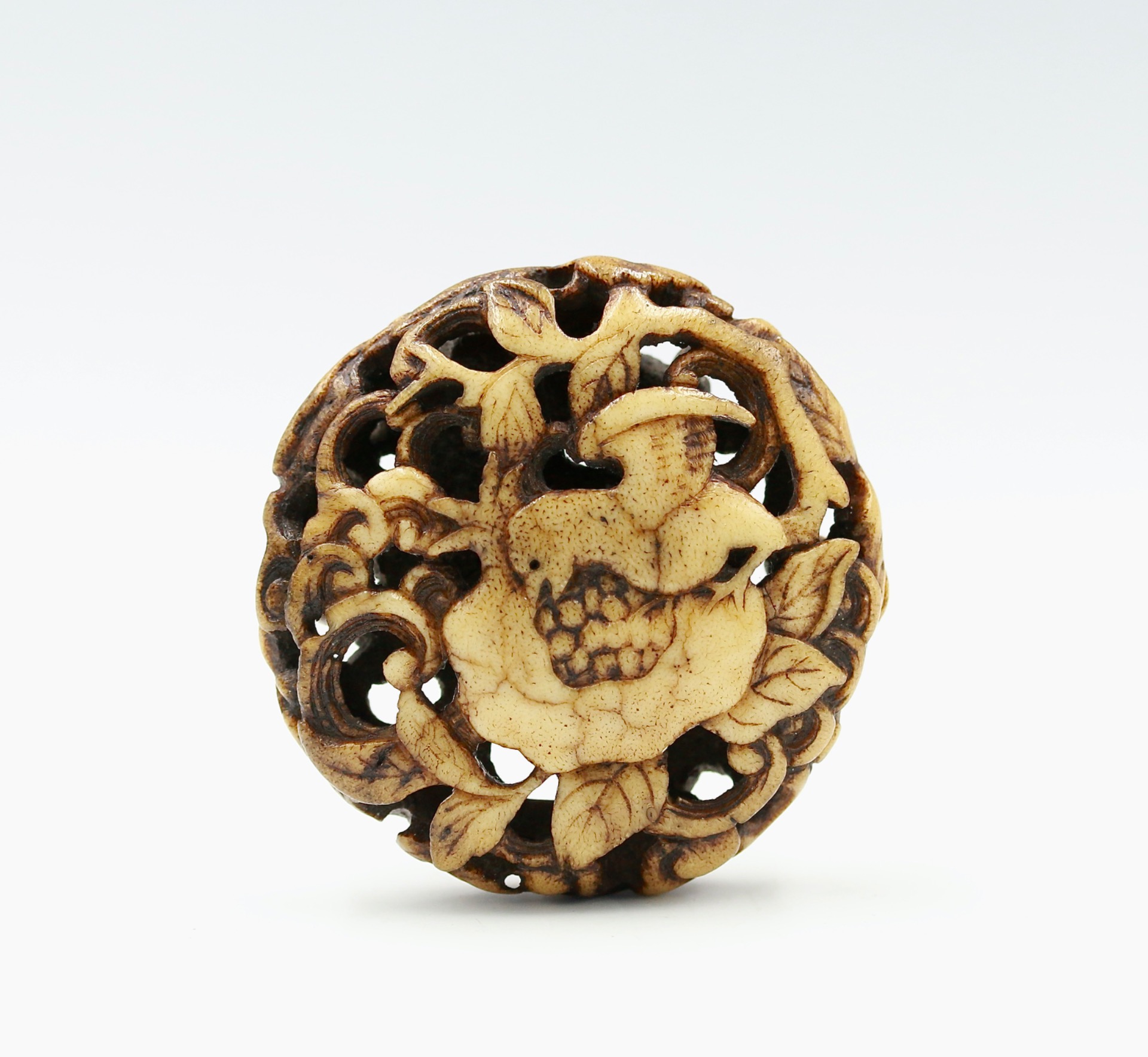 An antler ryusa, carved and pierced with the design of a bird, with outstretched wings, feeding on a pomegranate.