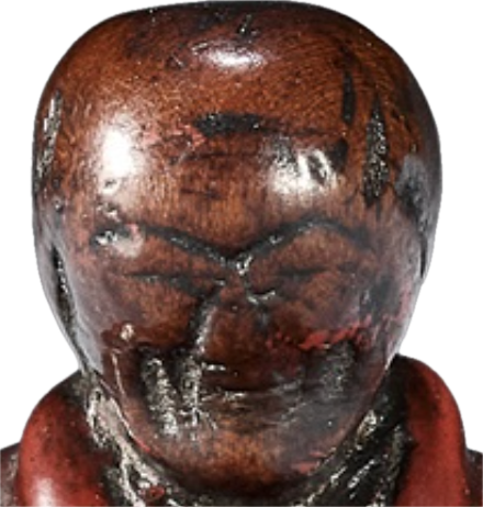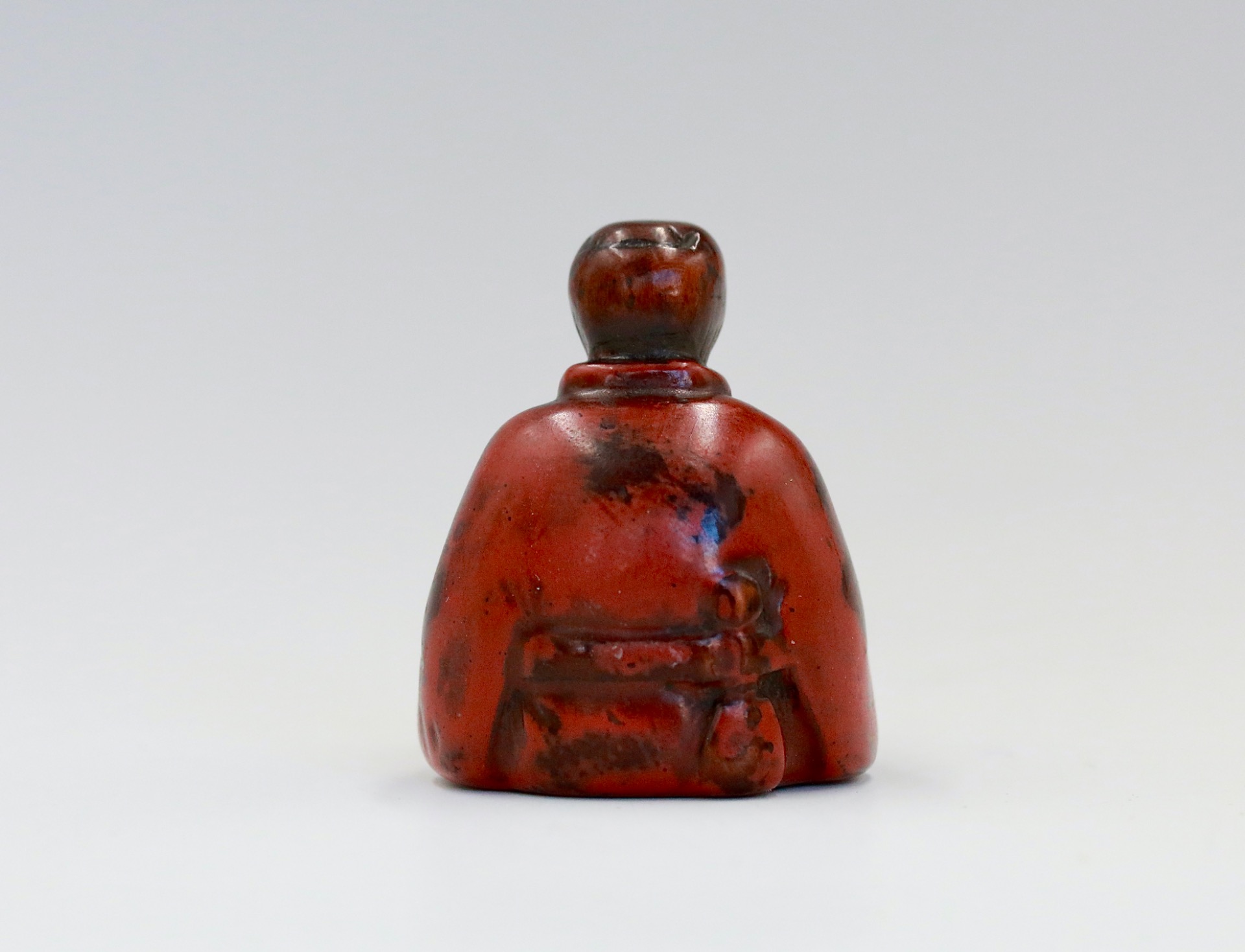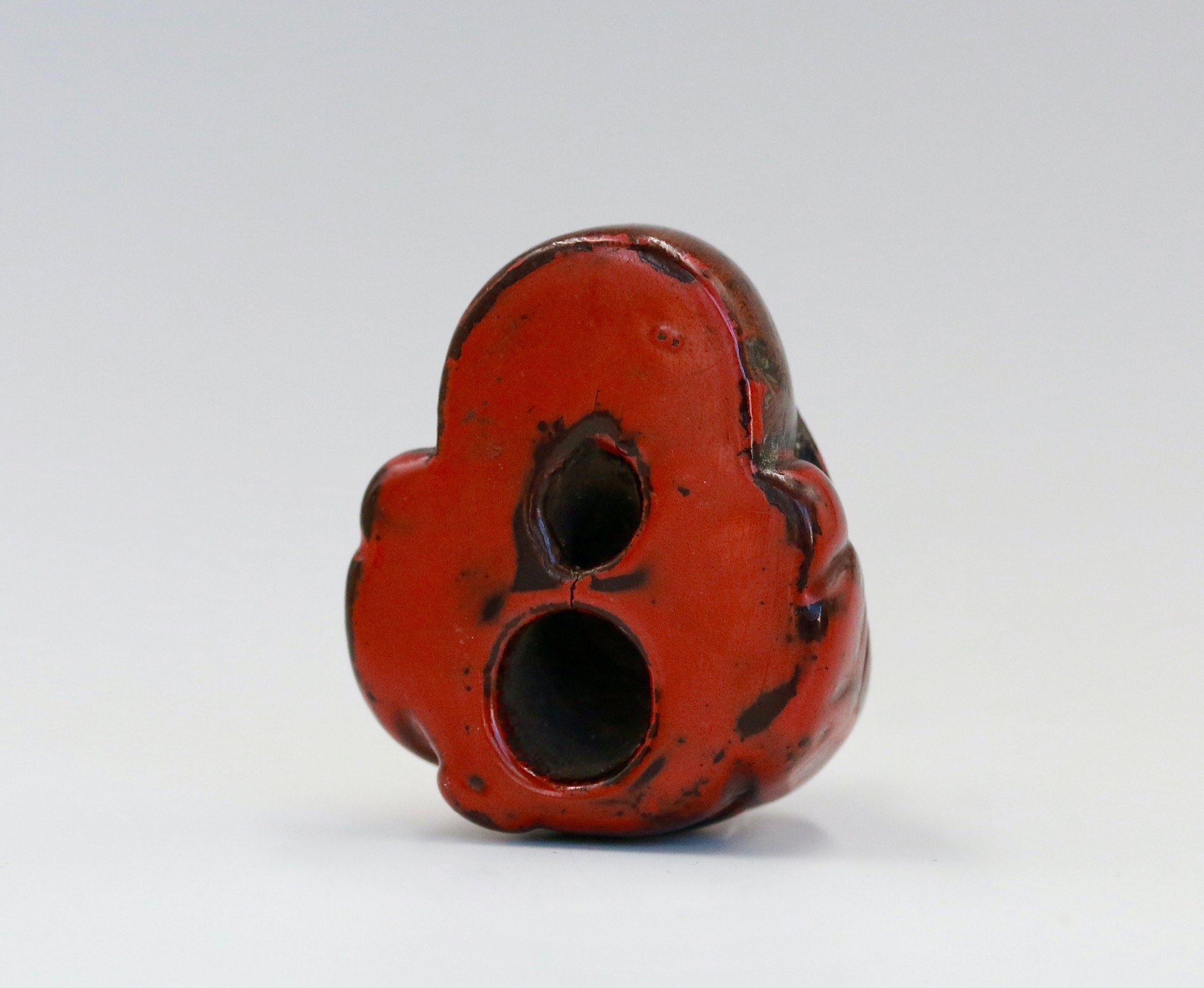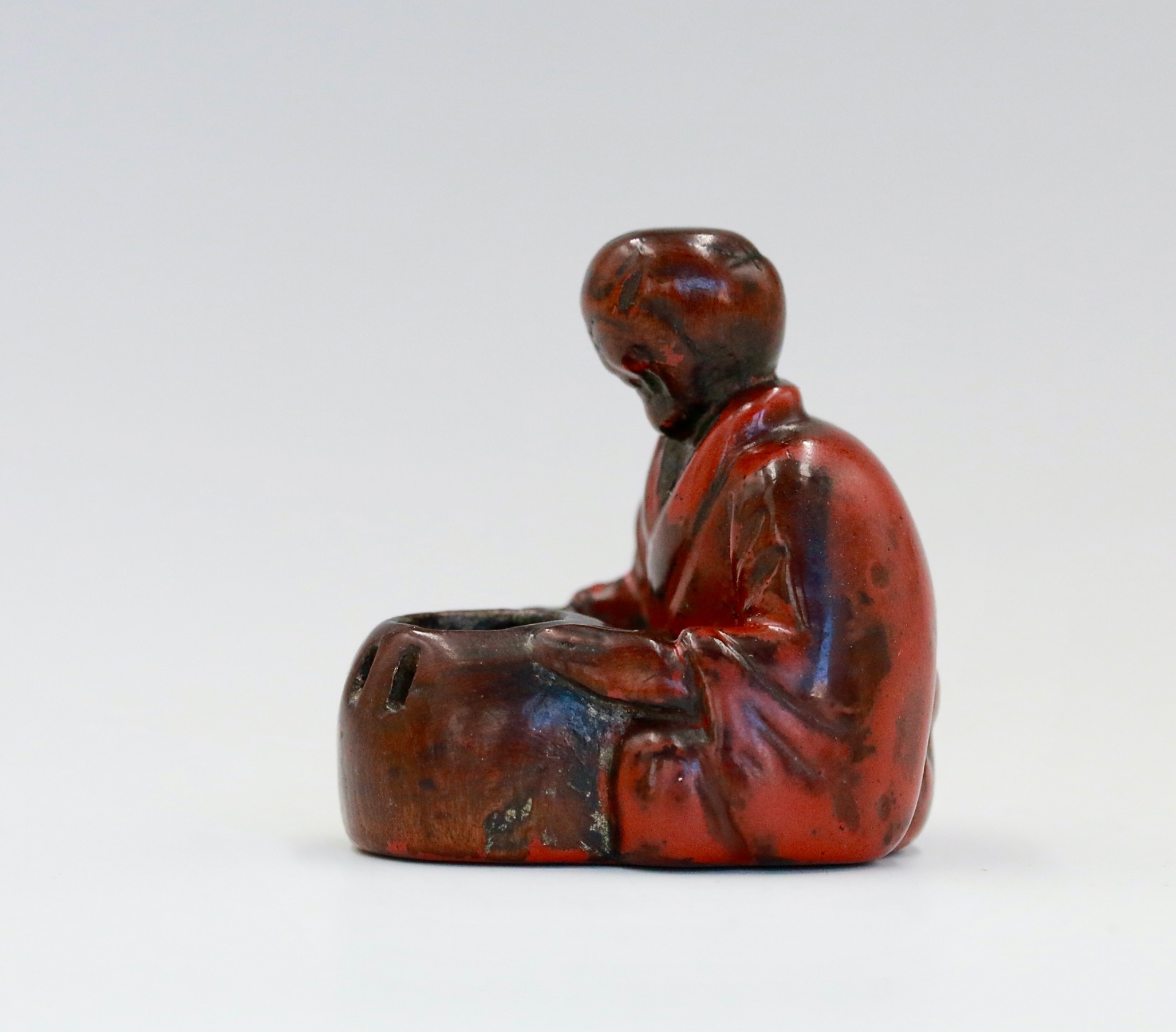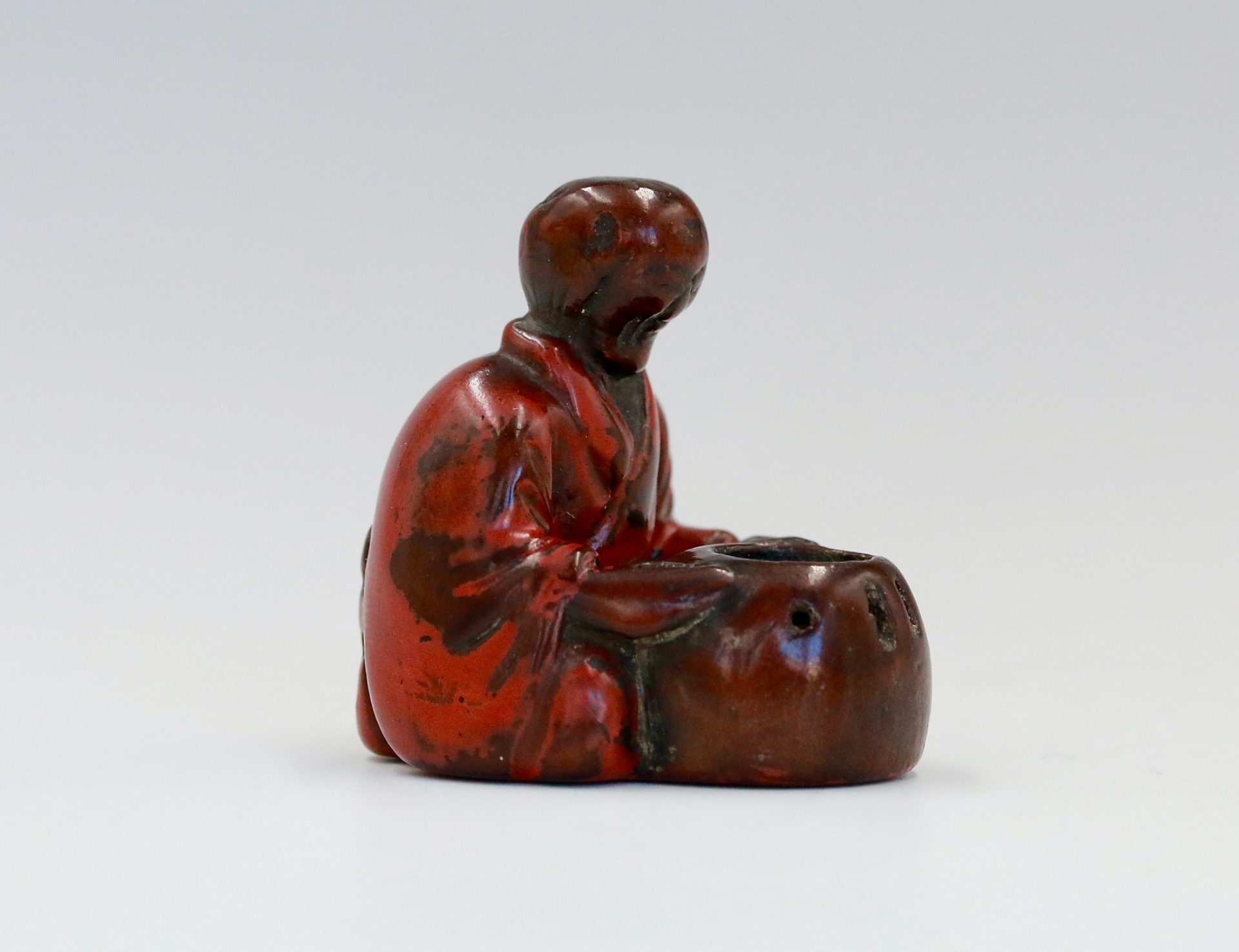 This old netsuke of a Chonin, seated beside a hand warmer is reminiscent of the work of Jobun. However, the details are heavily worn, which makes attribution now impossible. Furthermore, the work is lacquered (negoro-nuri) which would cover any signature left present.