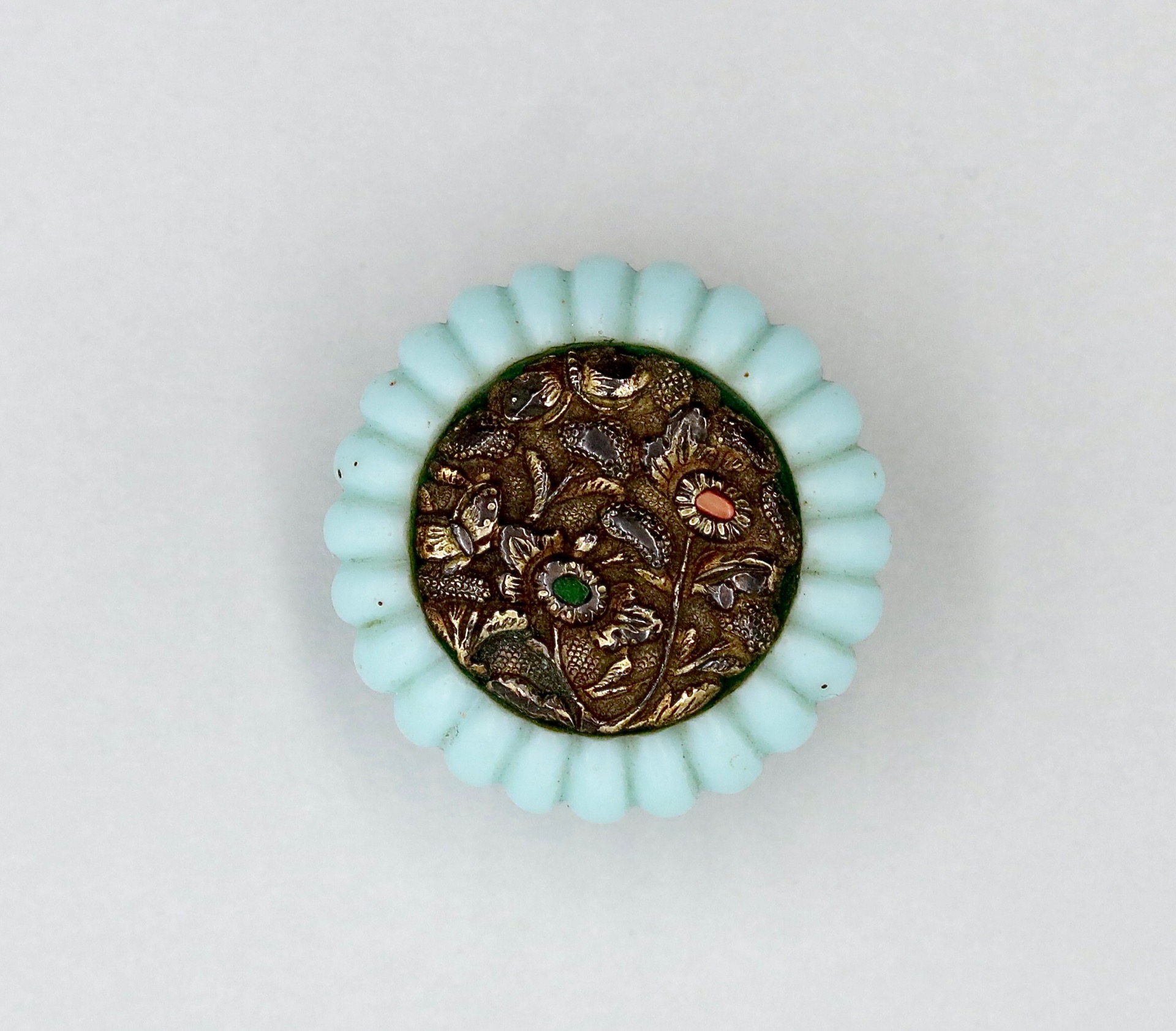 A rare kagamibuta. Formed with a ribbed pale blue glass bowl and a chased metal plate decorated with chrysanthemum and leaves. Gold highlights, with inlays of pink coral and malachite accentuate the details. The link for the himotoshi is a petal-grip and loop.