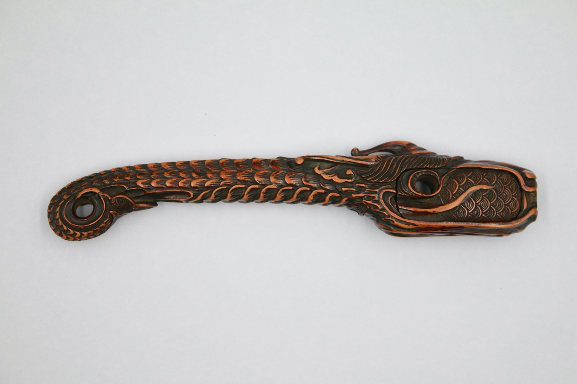 A fine wood yatate/obi-hasami netsuke. Carved in the form of a dragon with a curled tail which produces a natural aperture for attaching the cord. The elongated body, accentuated with fine scales is excavated to house a concealed brush in a secret chamber. The slim length of the body (3.5 to 4 inches long) is perfectly formed to sit behind the obi (sash) whilst the tail and head are formed to 'clip' to the top and bottom of the obi.