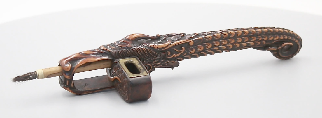It is in this pivoted position of the inkwell where the previously transverse aperture now runs longitudinally and aligns with the round 'nostril' hole at the front of the dragon, cleverly allowing the concealed brush to exit the internal chamber via the aforementioned openings.