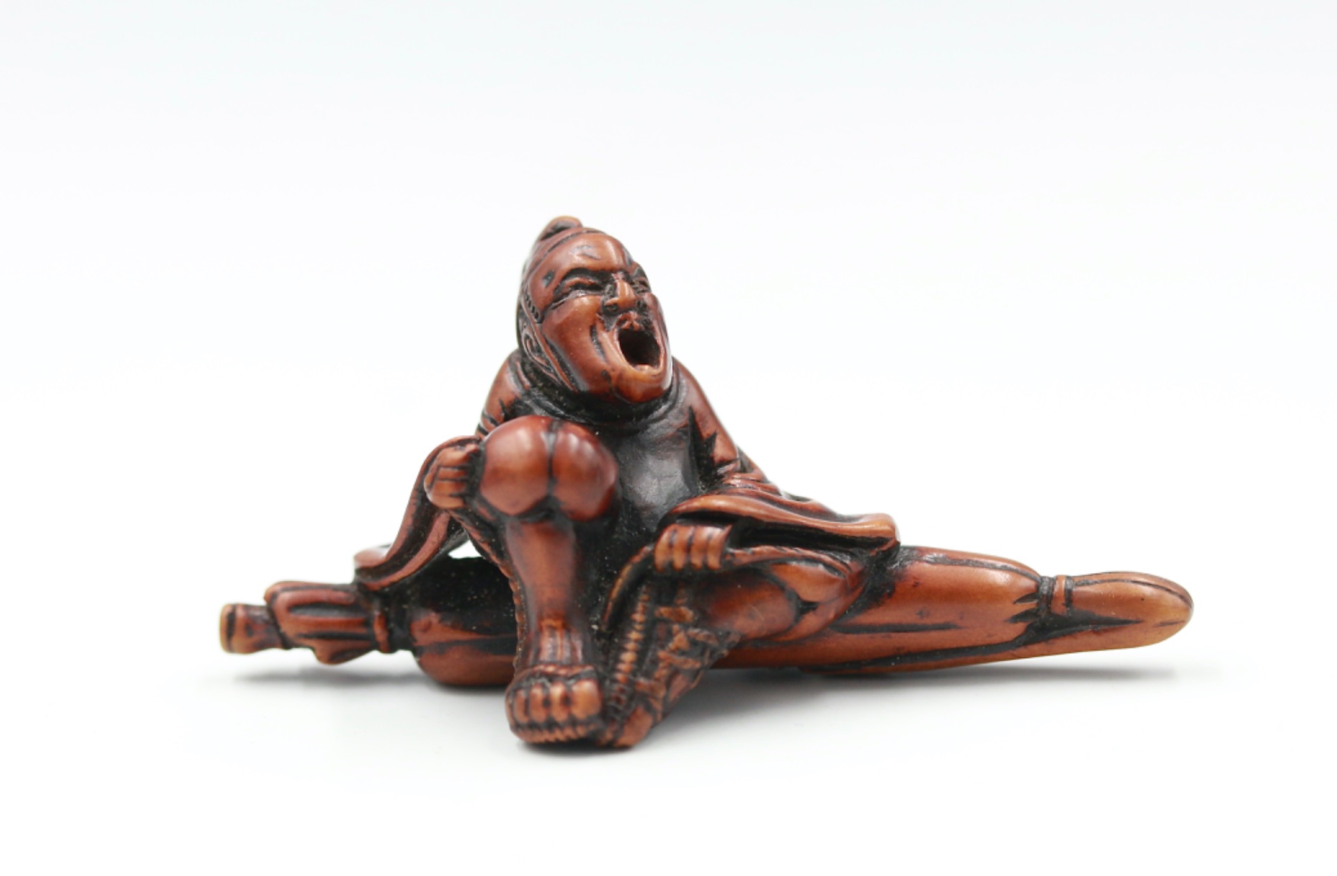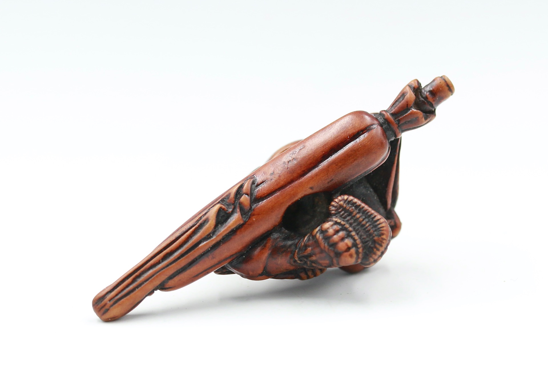 An interesting netsuke. An identical example is housed in a US collection with the signature Minko. However, certain features are similar to the work of migrating craftsman, Shugetsu, who was living in the Shimanouchi area of Osaka, later relocating to Edo.