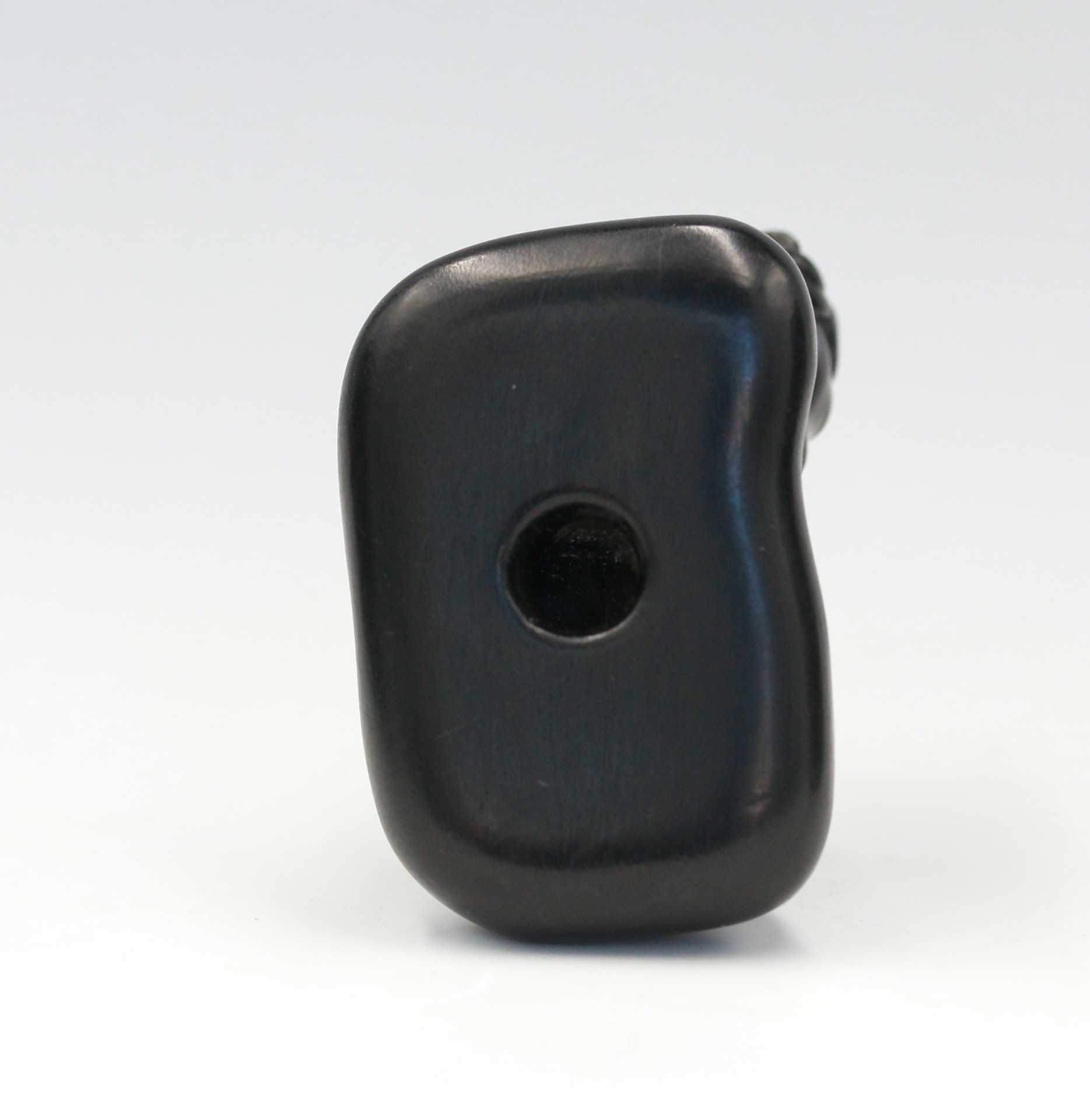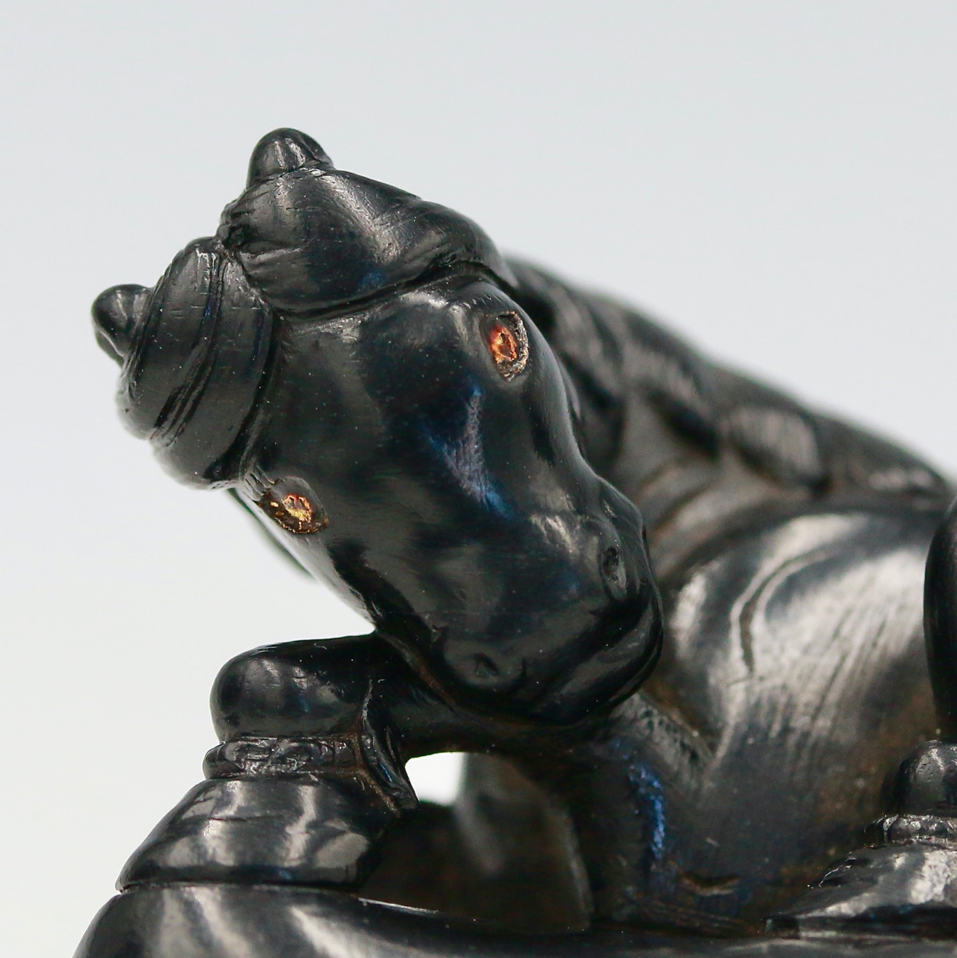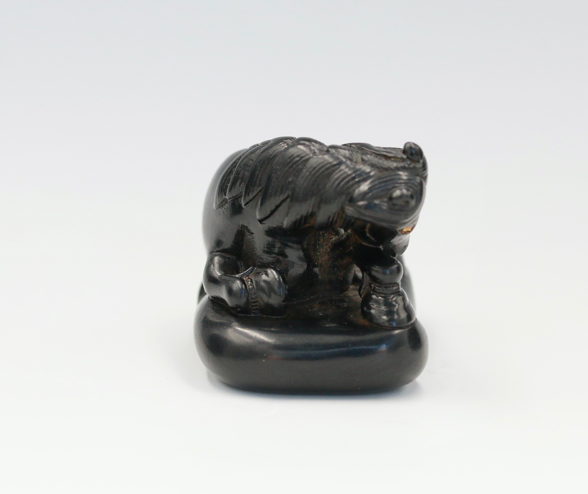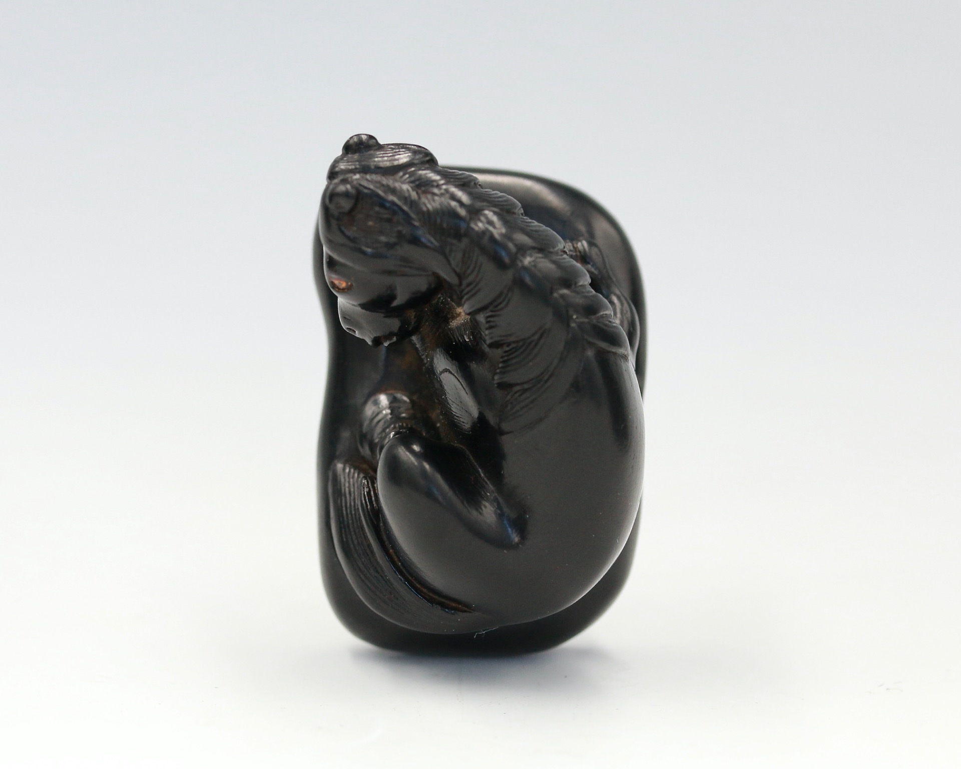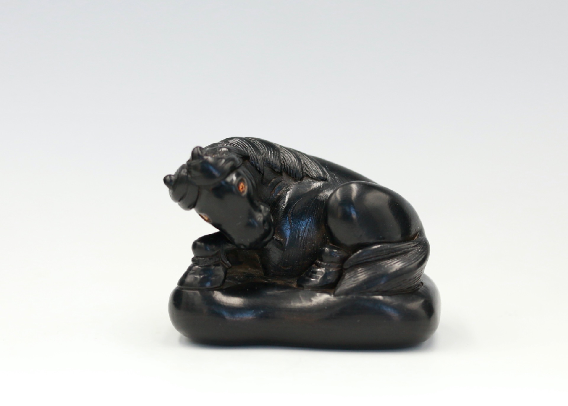 The modelling is excellent with numerous subtle details which, in this material, are difficult to capture in an image. With the aid of a magnifying glass, one can see delineation of hoof, coronet and fetlock. Hairwork is present and the base is ergonomically asymmetric following the contours of the horse. Lovely touches, on a fine netsuke.