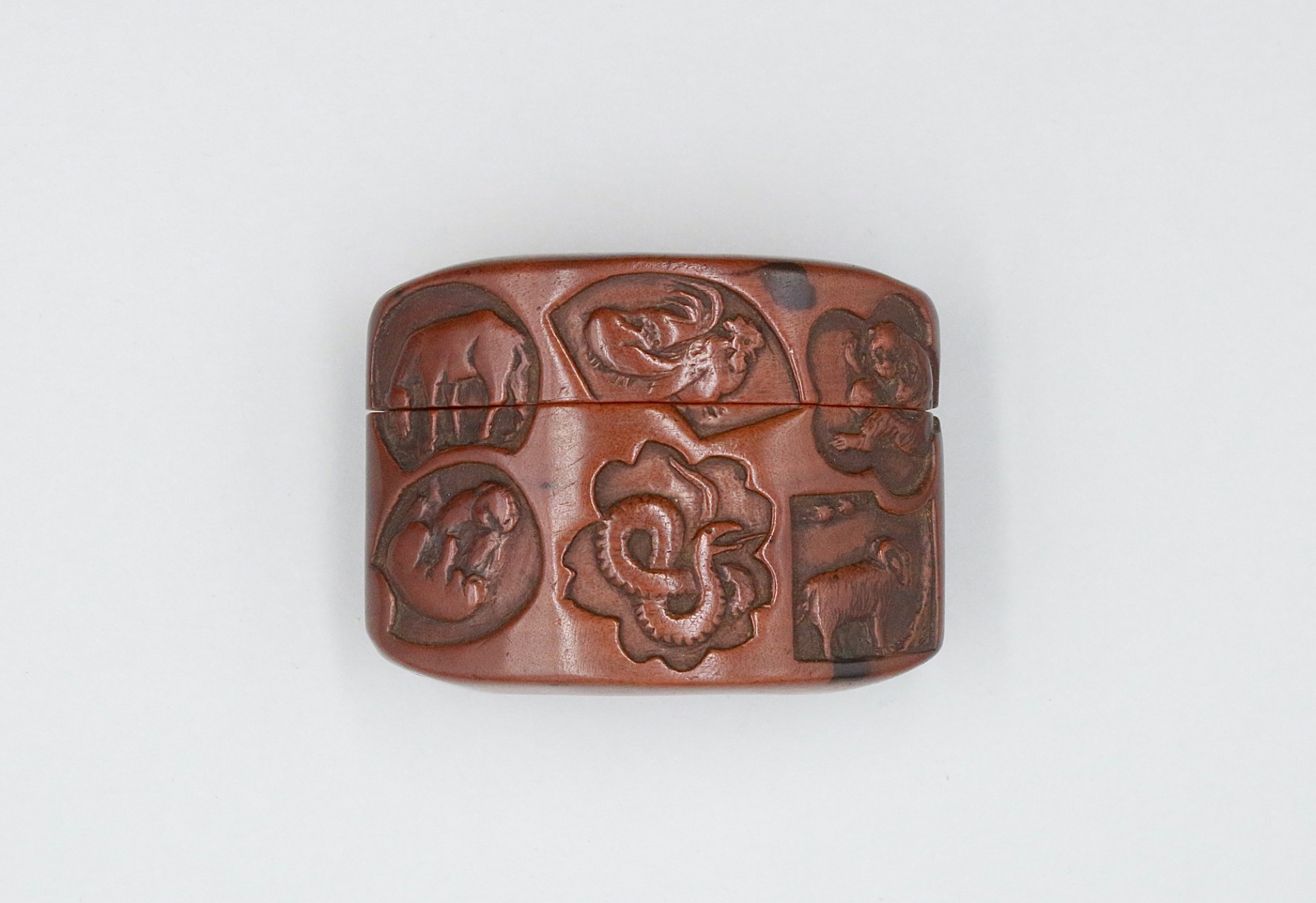 A wood tonkotsu, carved with recessed panels (various shapes) each containing one of the zodiac animals.