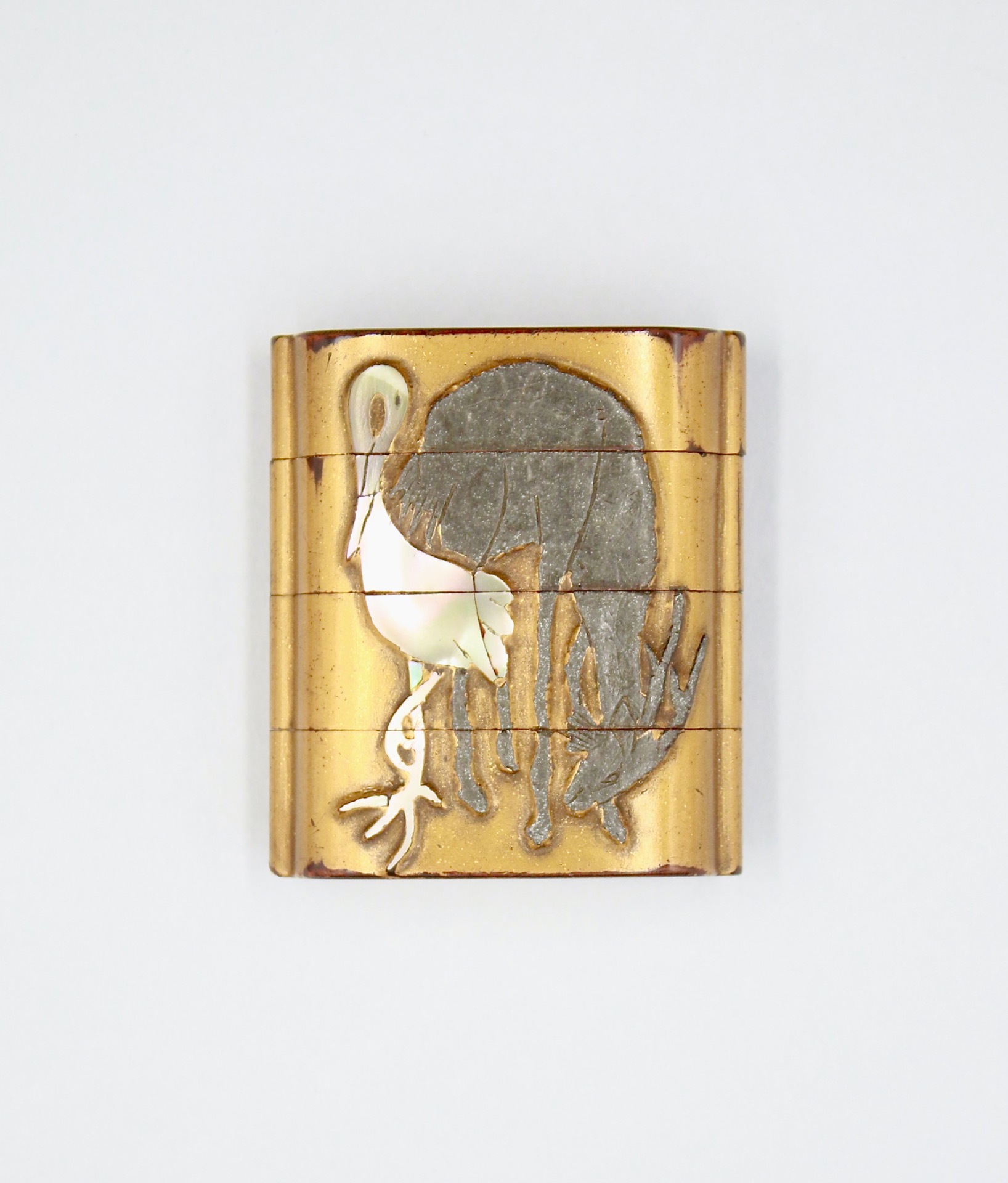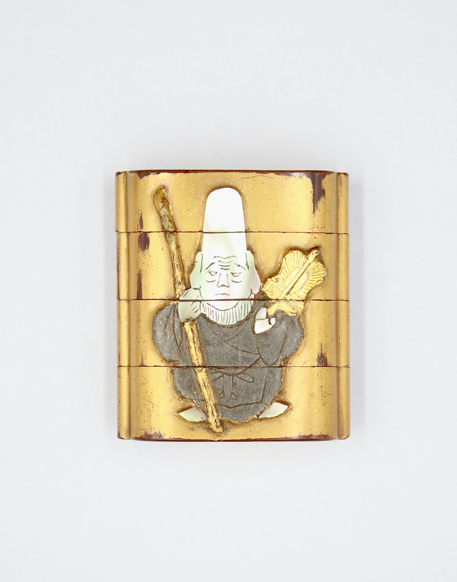 Three case inro, decorated with Jurojin. The reverse with a Crane and a Deer. Lacquer, mother of pearl, pewter and gold foils.