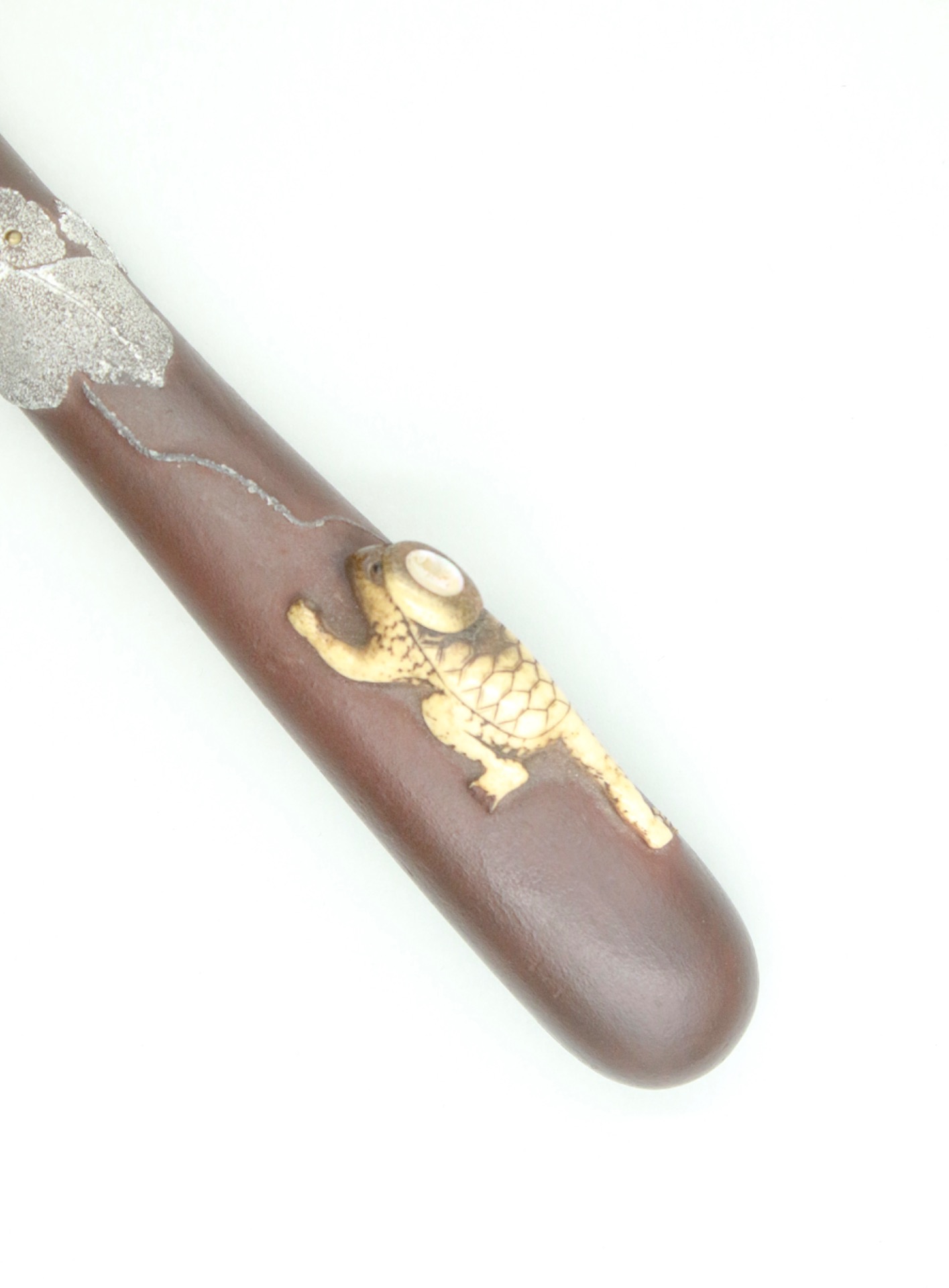 A large otoshizutsu, in the form of a gourd lacquered brown. This gourd has a trailing vine in mitsuda-e which is heavily textured. Crawling over this large gourd is a Kappa (water imp) carved in antler, with inlaid eyes (horn) and crown of the head (mother of pearl).