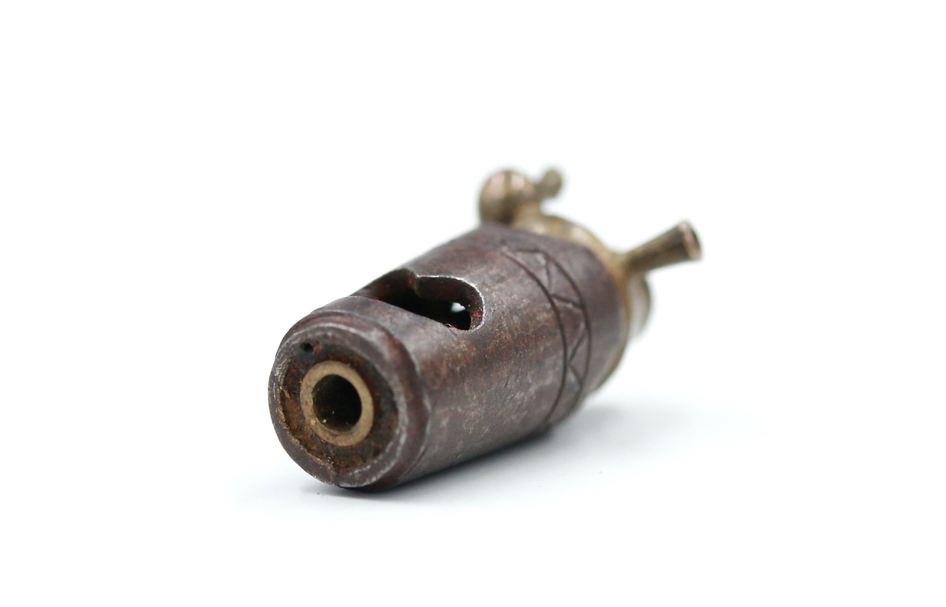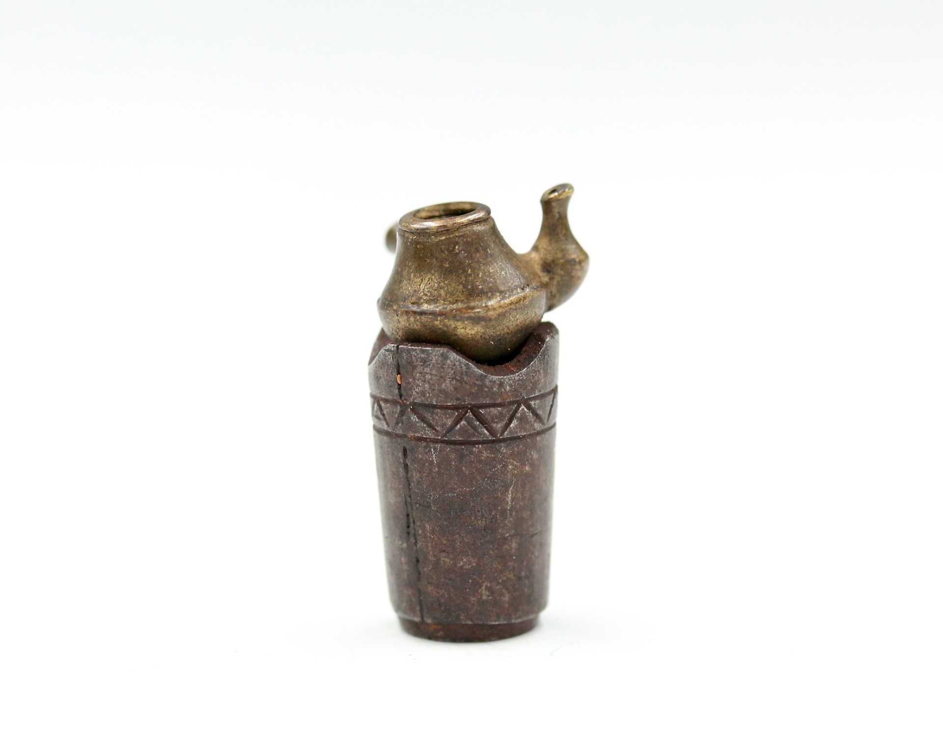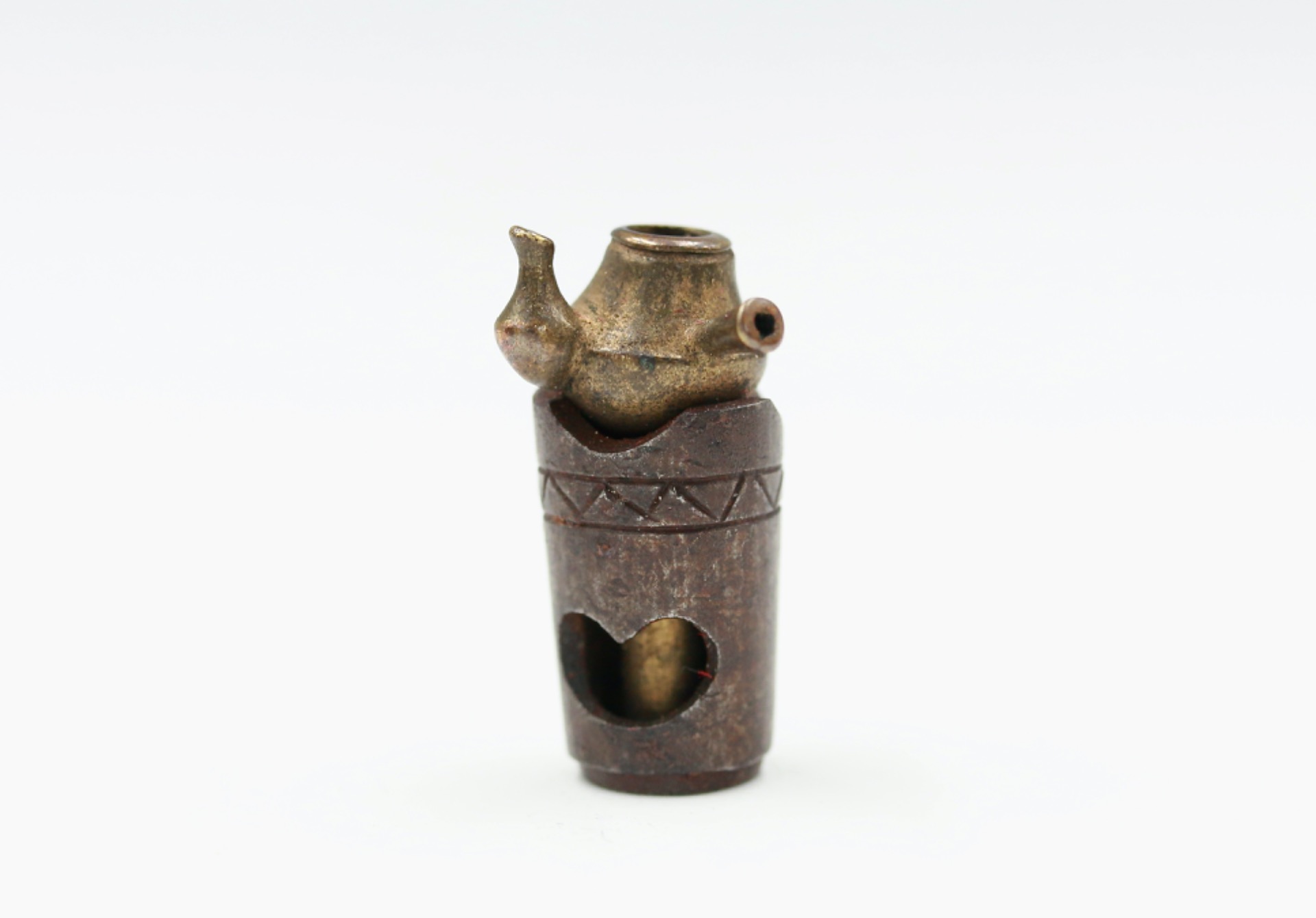 A metal ojime formed as a Kettle & Brazier.