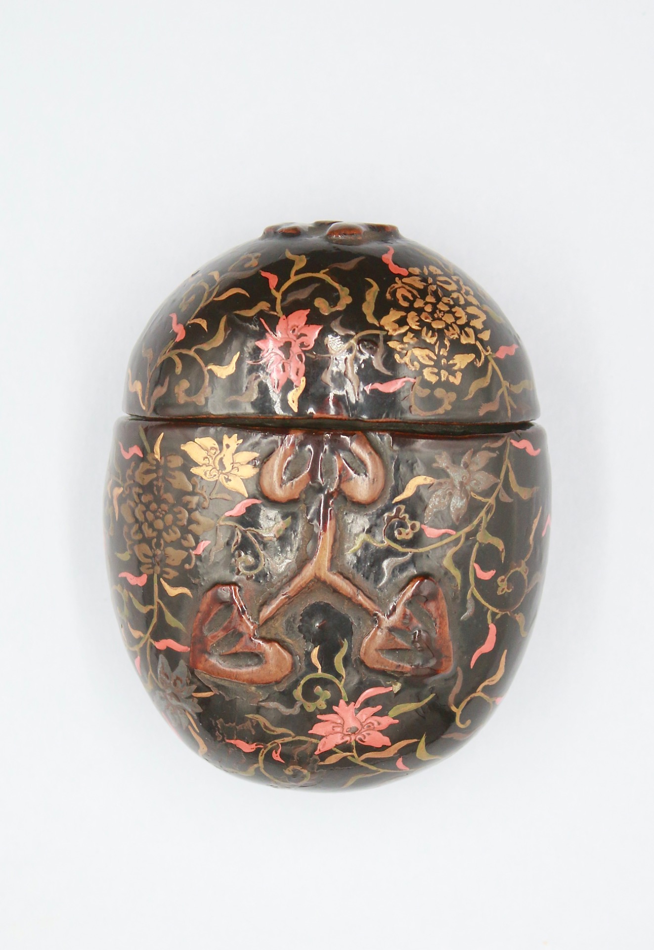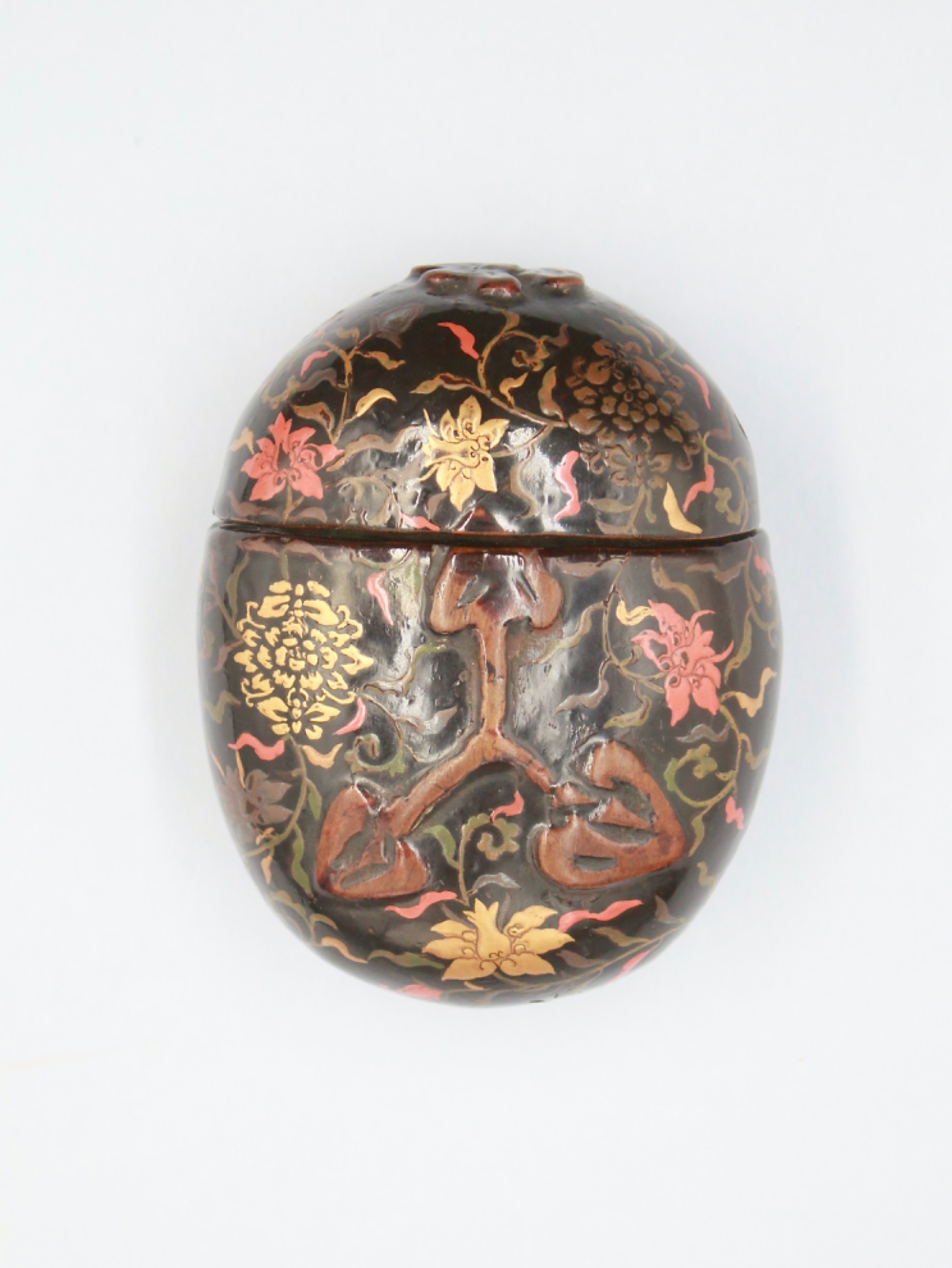 A large old Tonkotsu of oval shape. Carved and lacquered with various flowers and foliage.