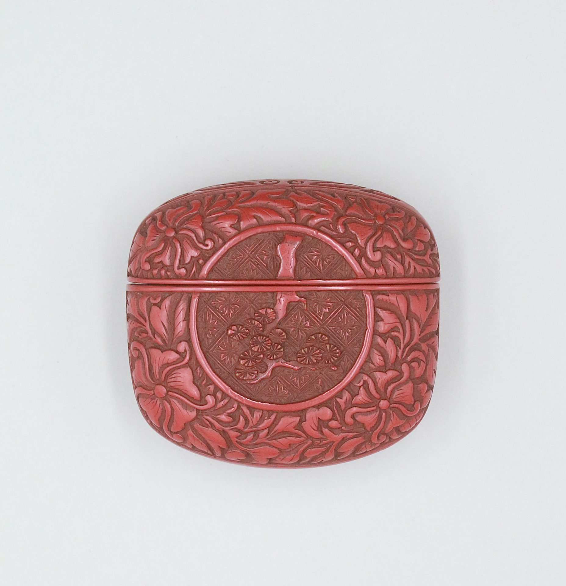 A tsuishu lacquer tonkotsu, carved to each side with a central circular lozenge, each containing a pine branch. Flowers and foliage surrounding. Black lacquer interiors.