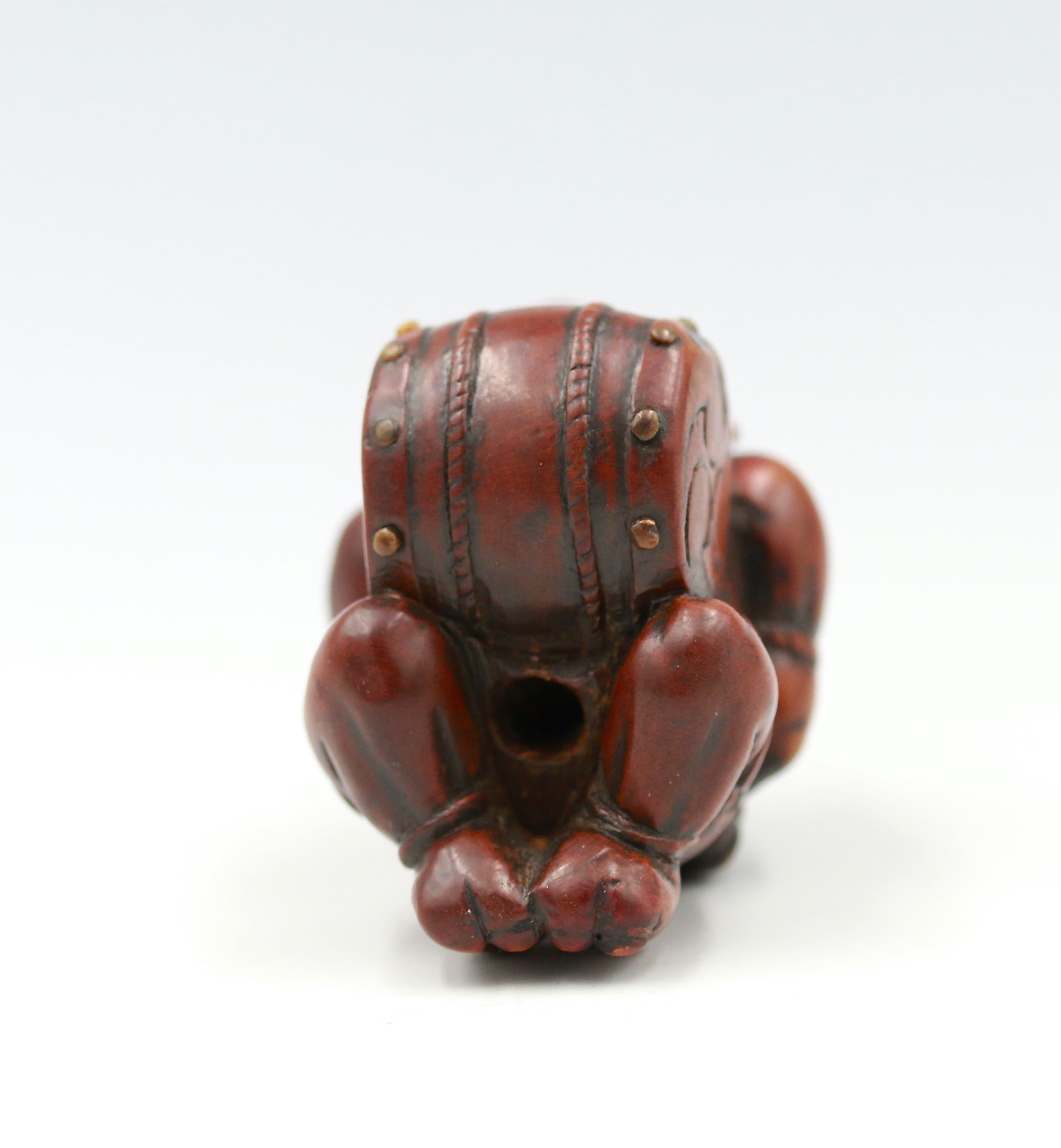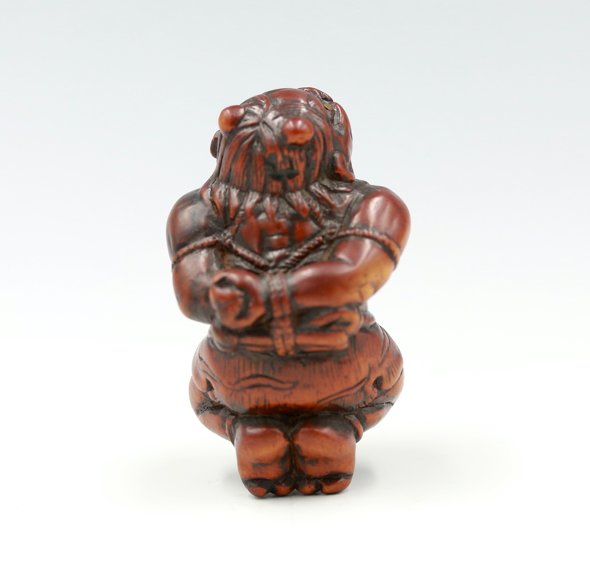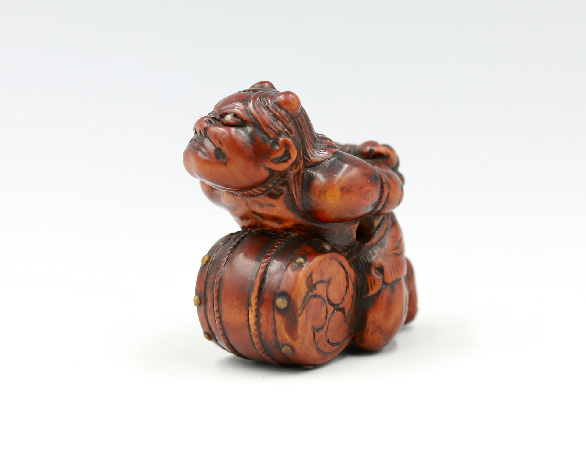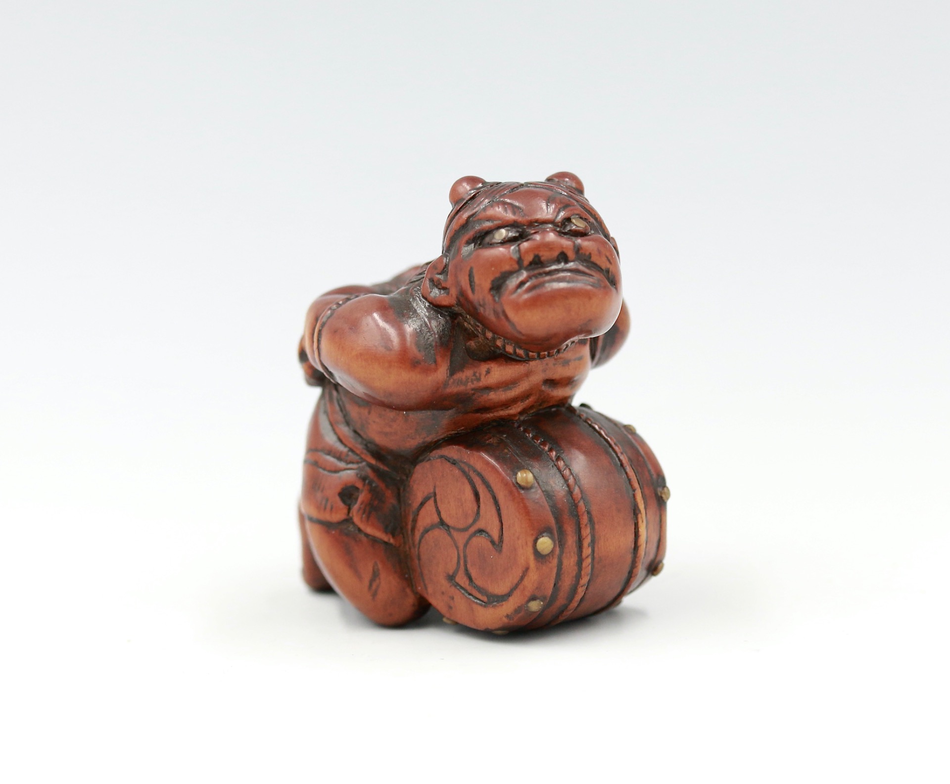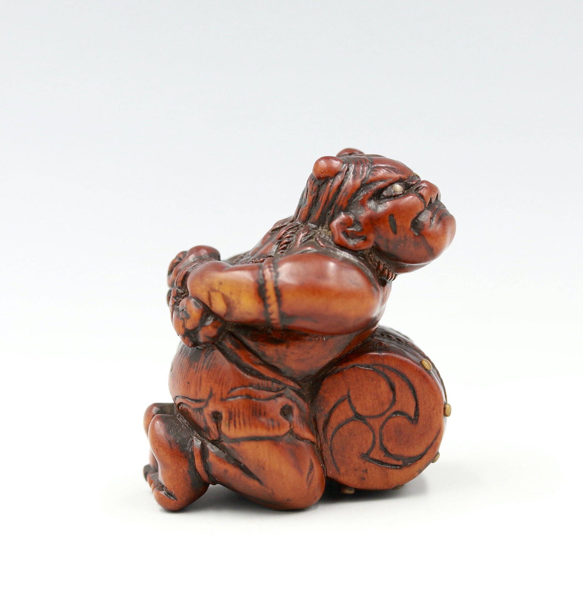 A wood netsuke of Raiden, bound by rope, unable to create storms. Eyes and details on his drum inlaid in brass. Likely an amulet against the fire, floods etc, the aftereffects of storms, which Raiden's activities are attributed too.
