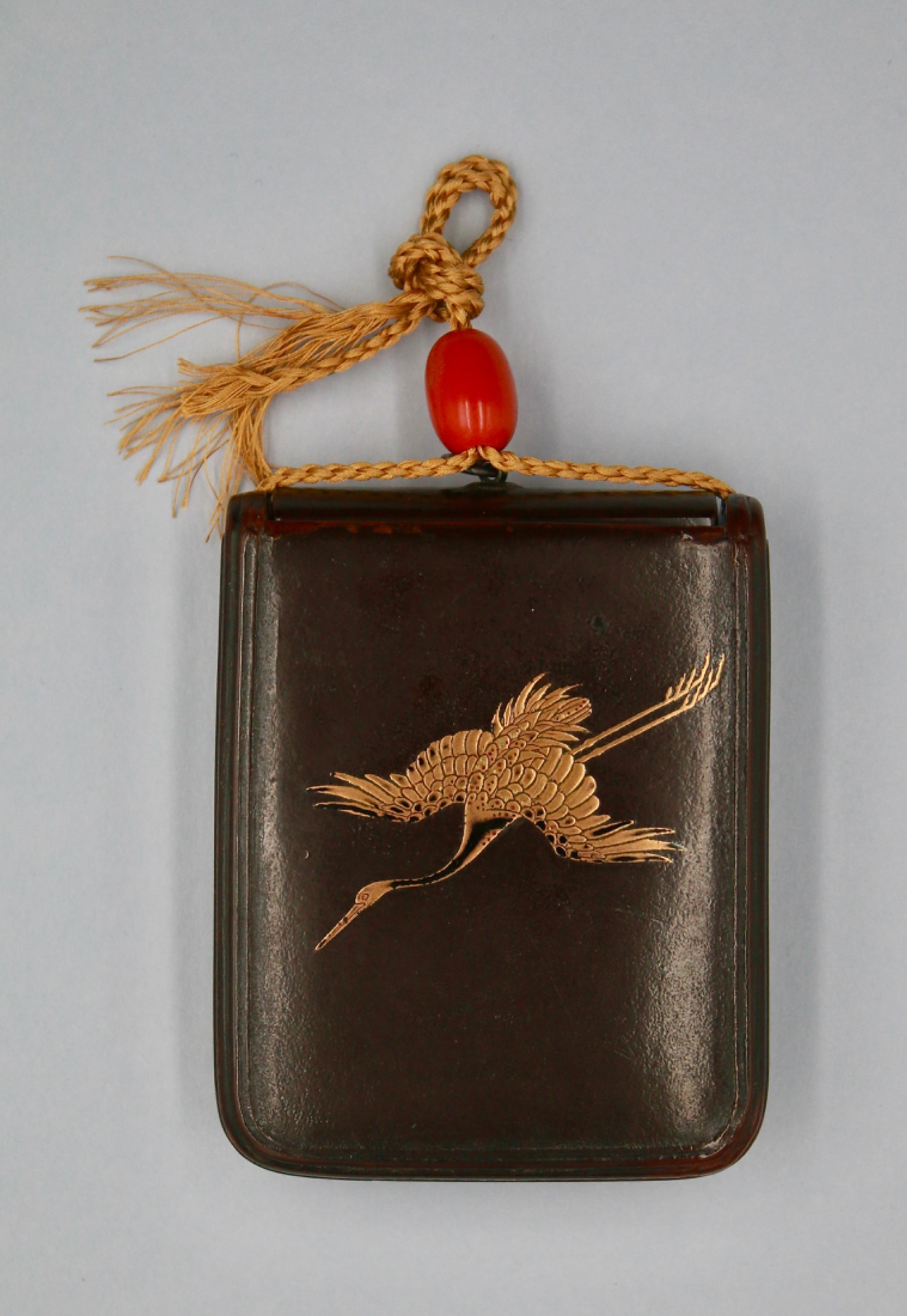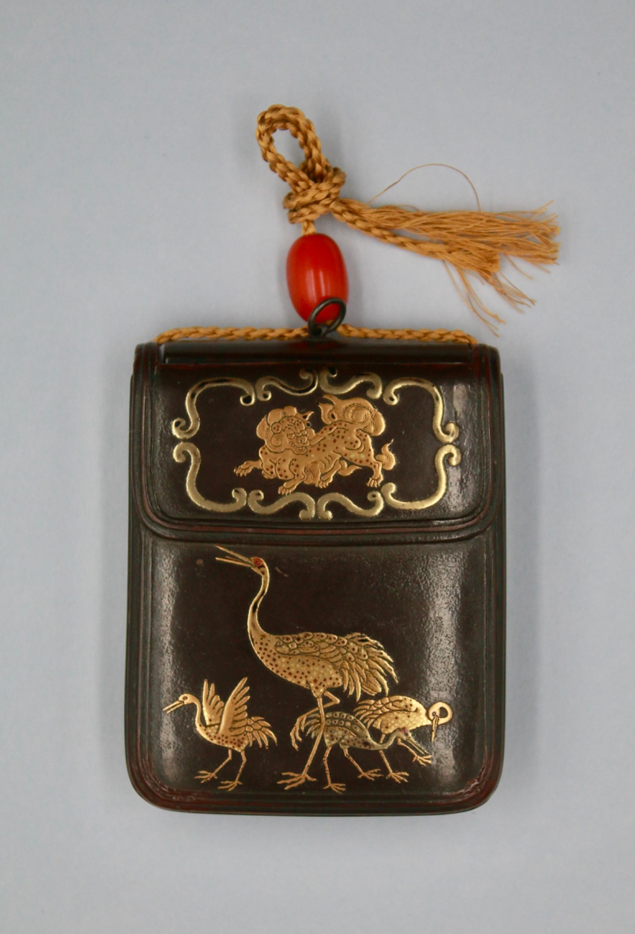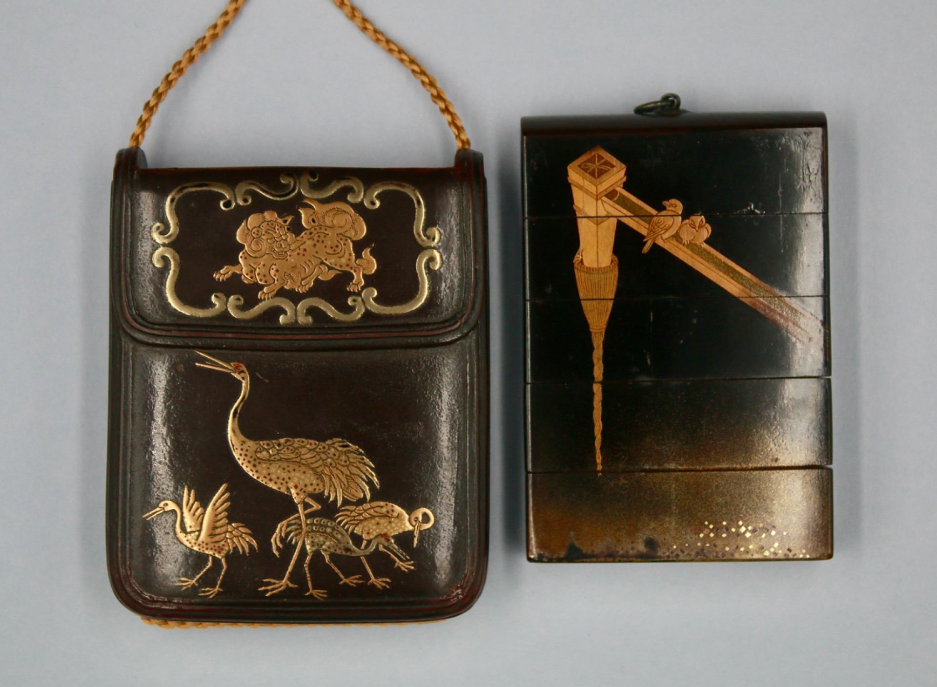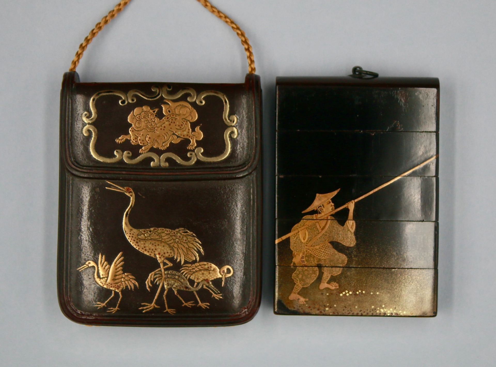 A saya sagemono, in the form of a pouch. Decorated with Cranes and Shishi in gold takamaki-e. The interior a four case inro decorated with a farmer scaring birds from stealing his grain, achieved in togidashi.