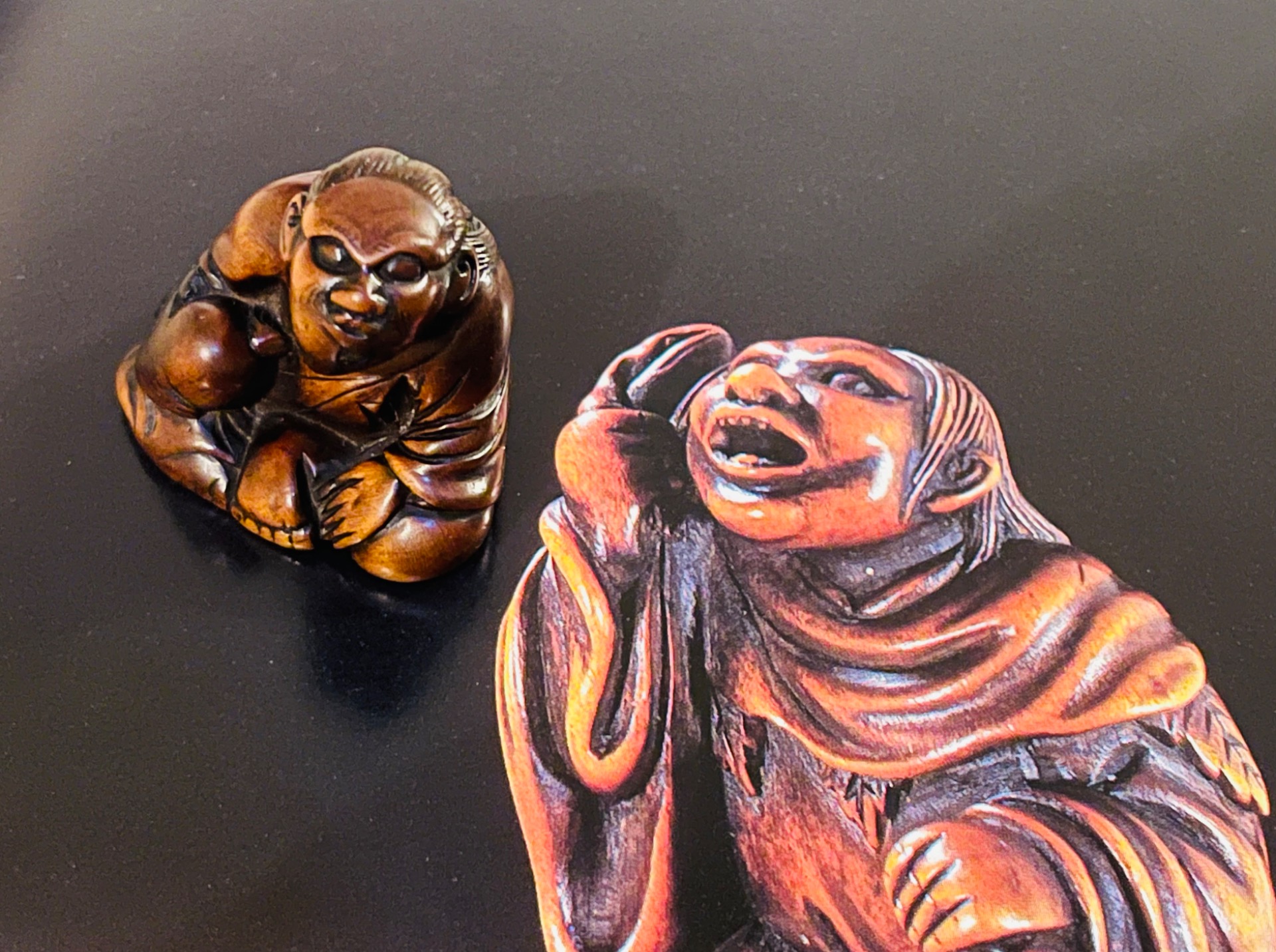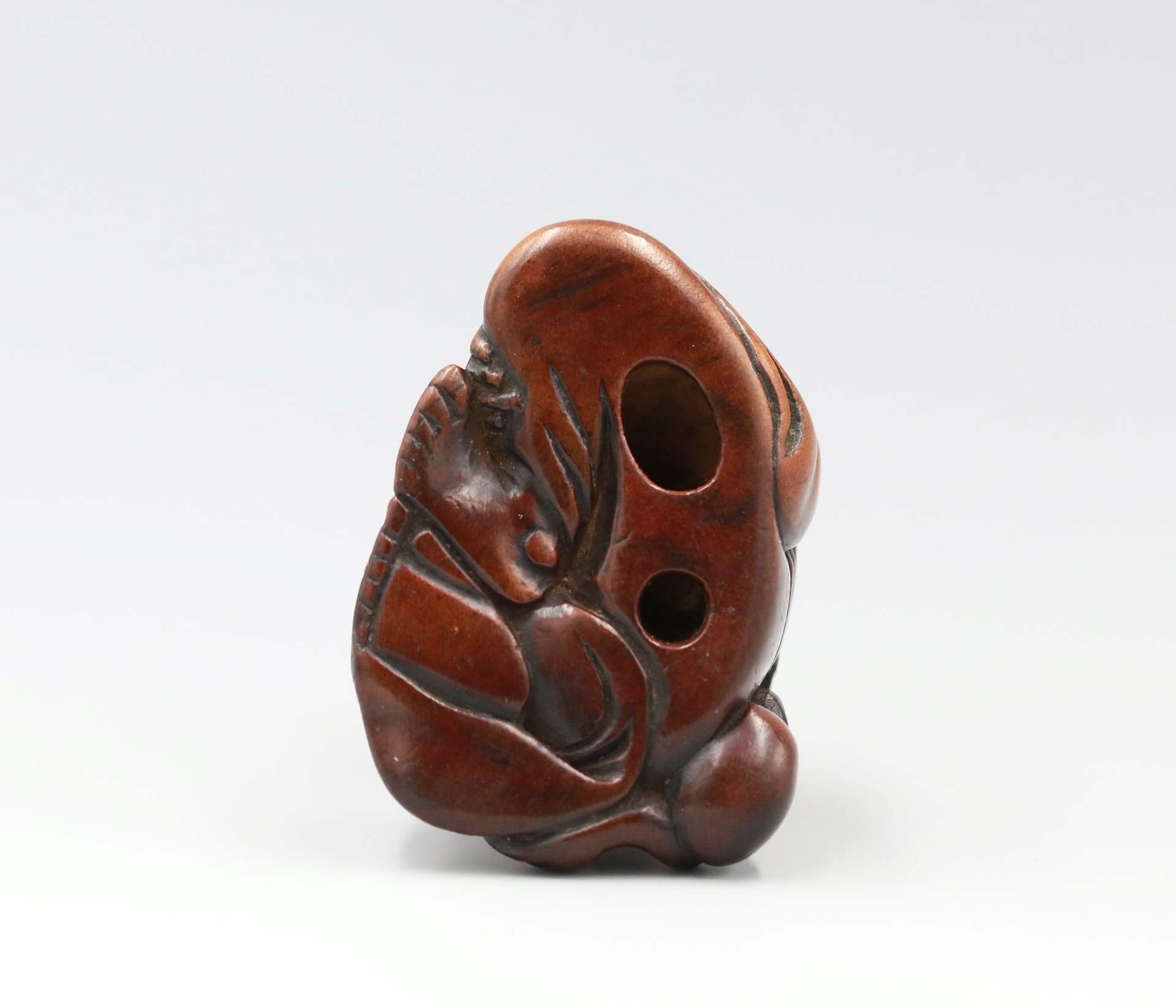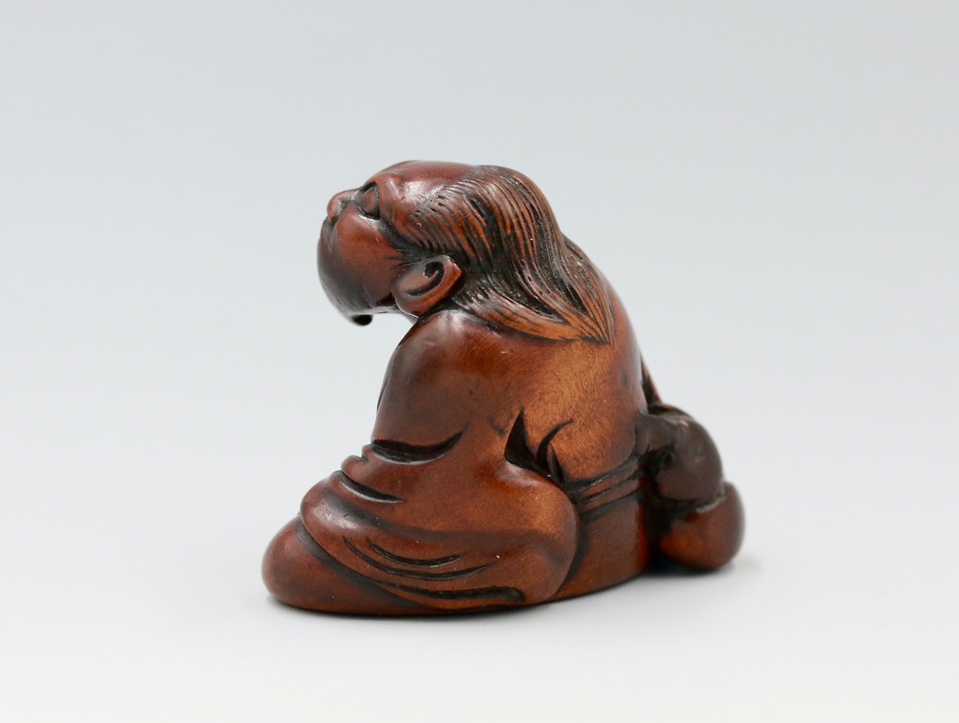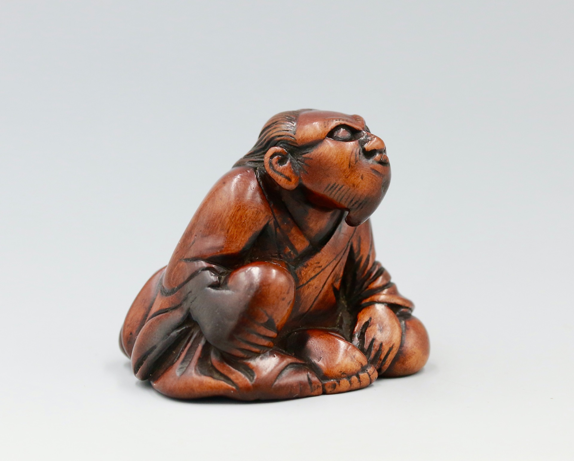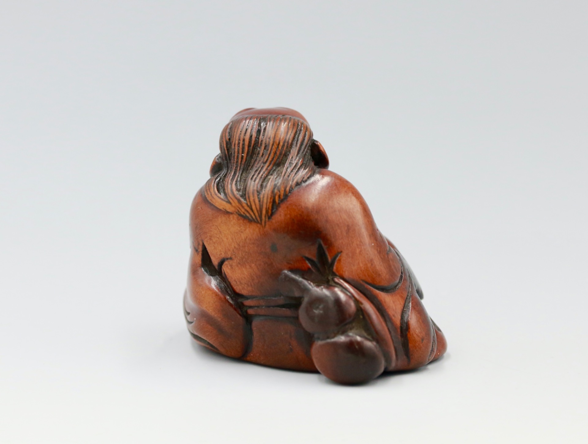 A rare wood study of a seated Sennin, likely Tekkai blowing his soul.