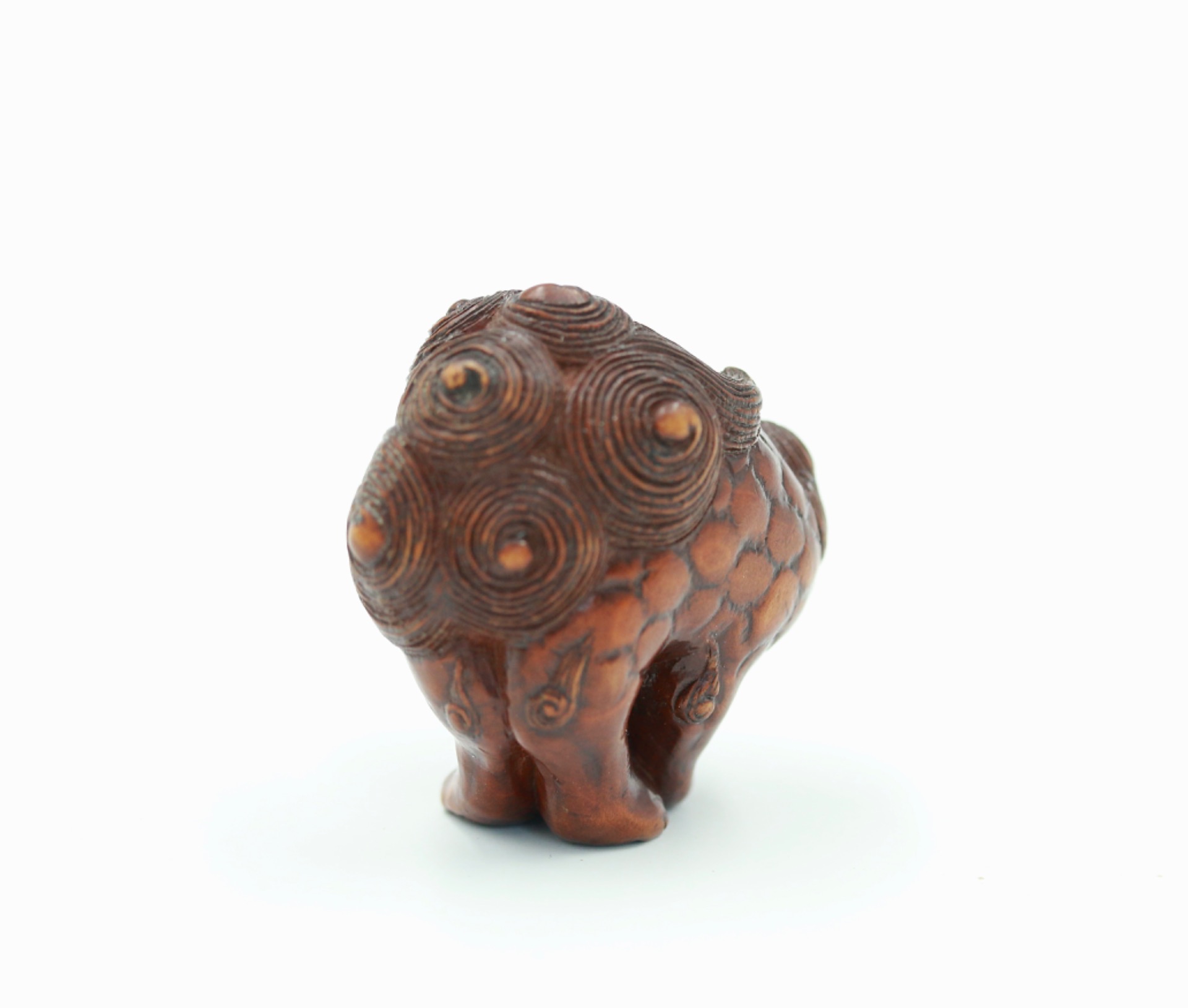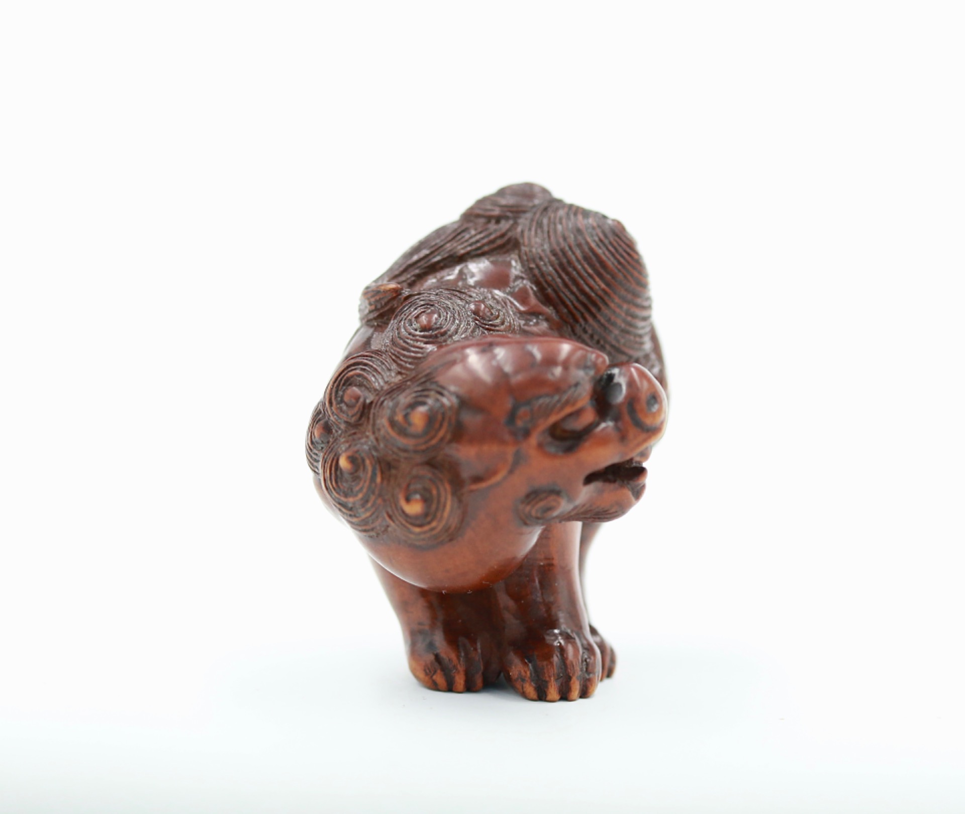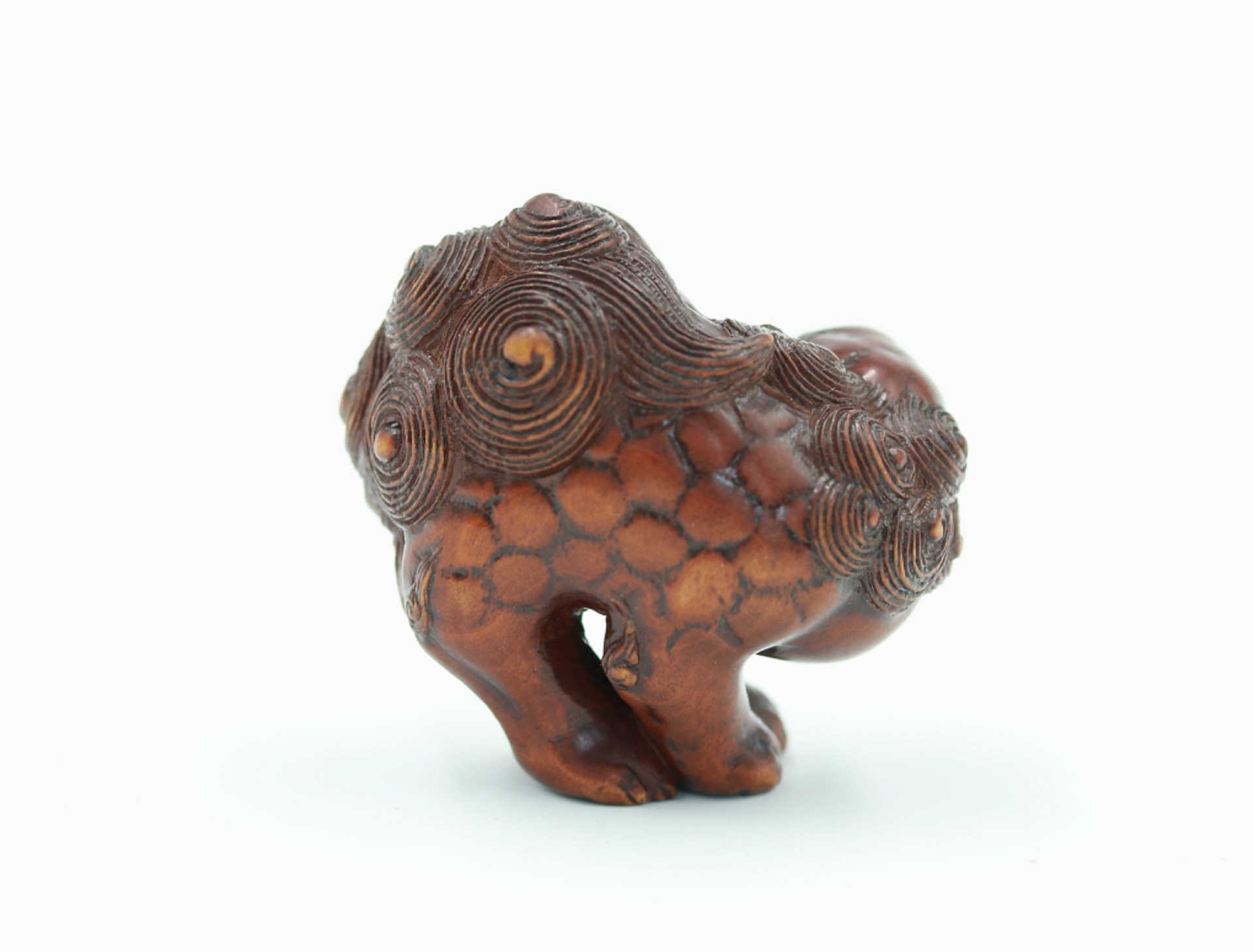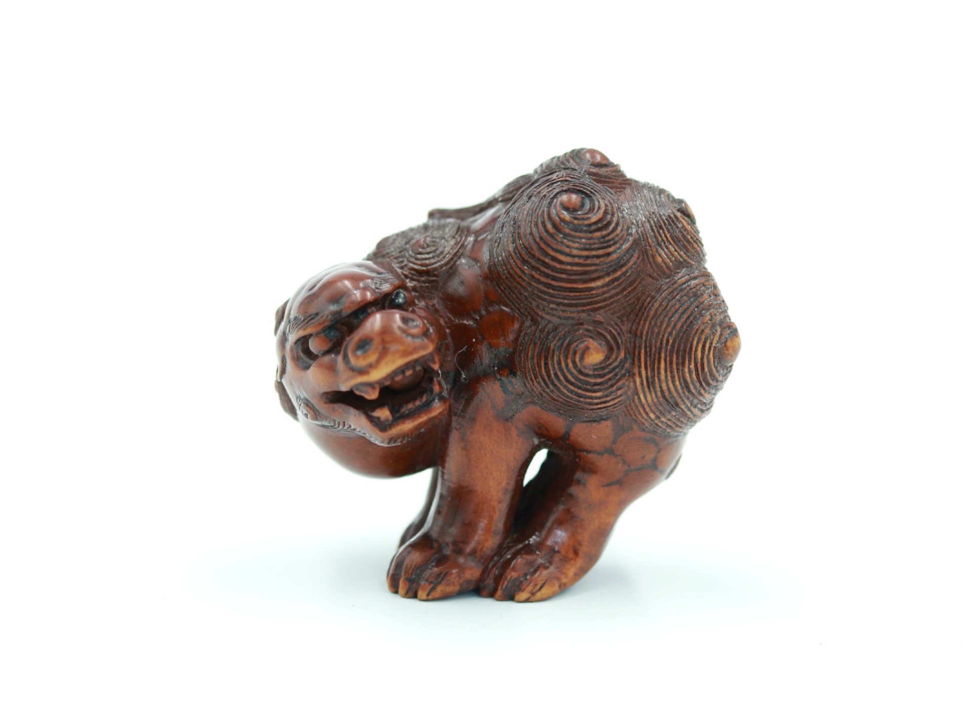 A wood netsuke of a Shishi by Toshimaru (利丸).