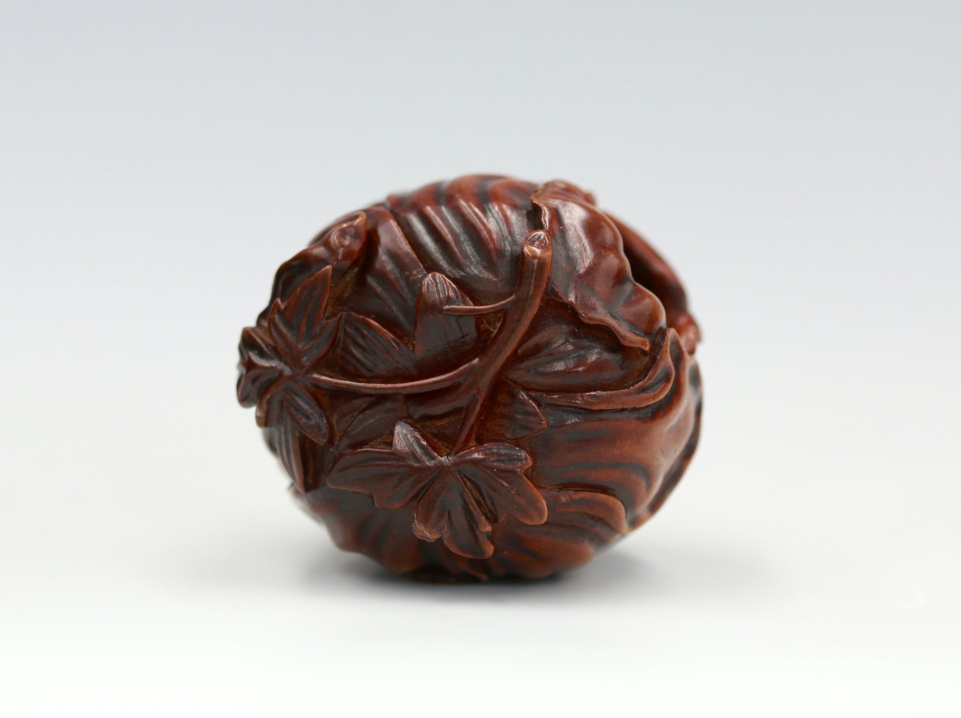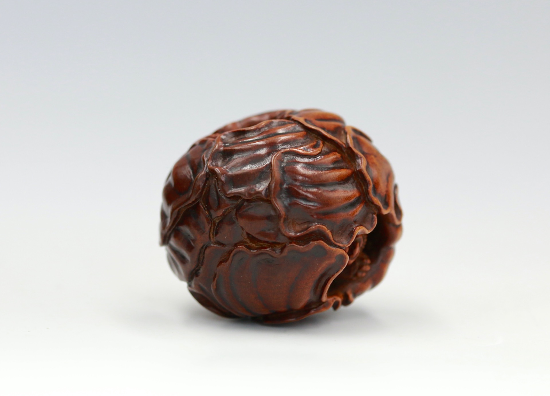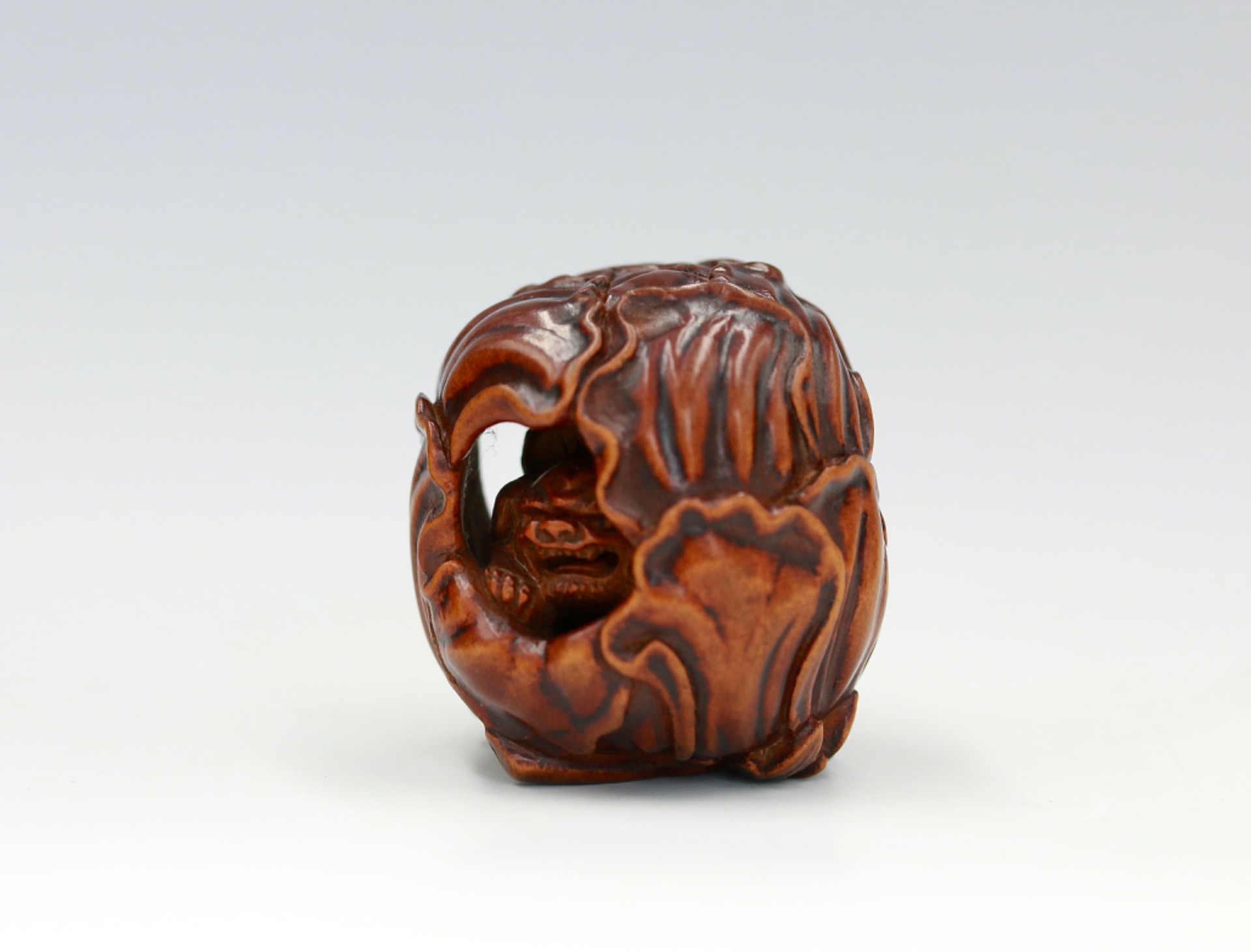 A perfect netsuke. This might sound a strange opening statement, albeit a globe-shaped design are the most perfect form for a netsuke, ie. In terms of function. When being thrust between hip and belt, a limitation in protruding elements are a must, globe-shaped designs have none.