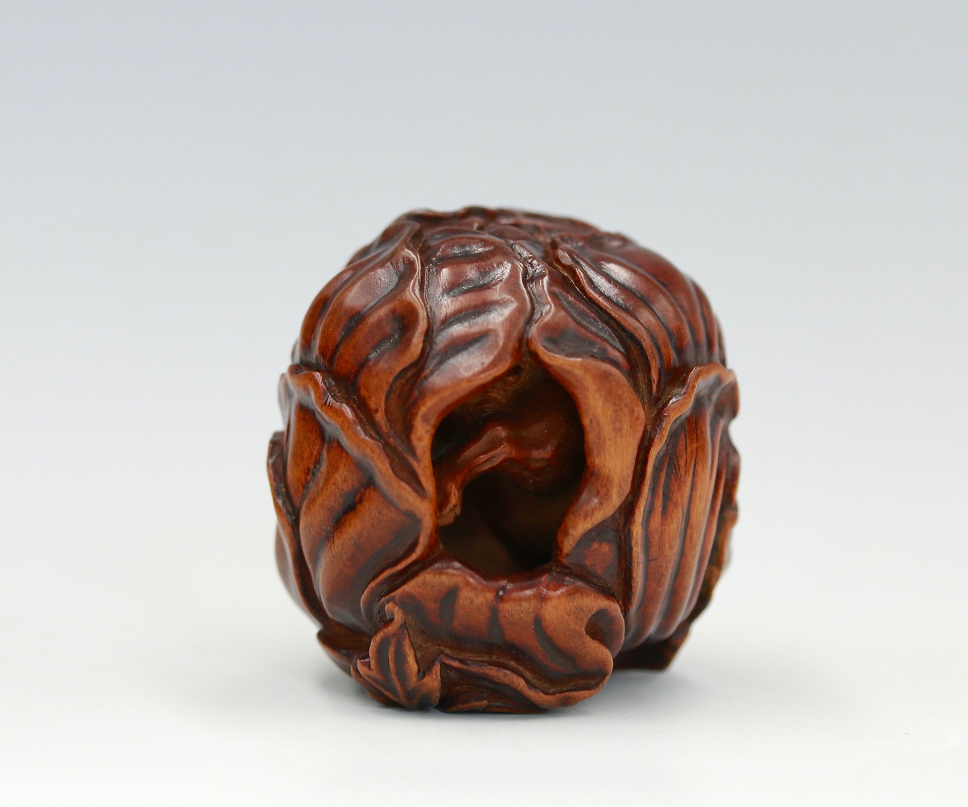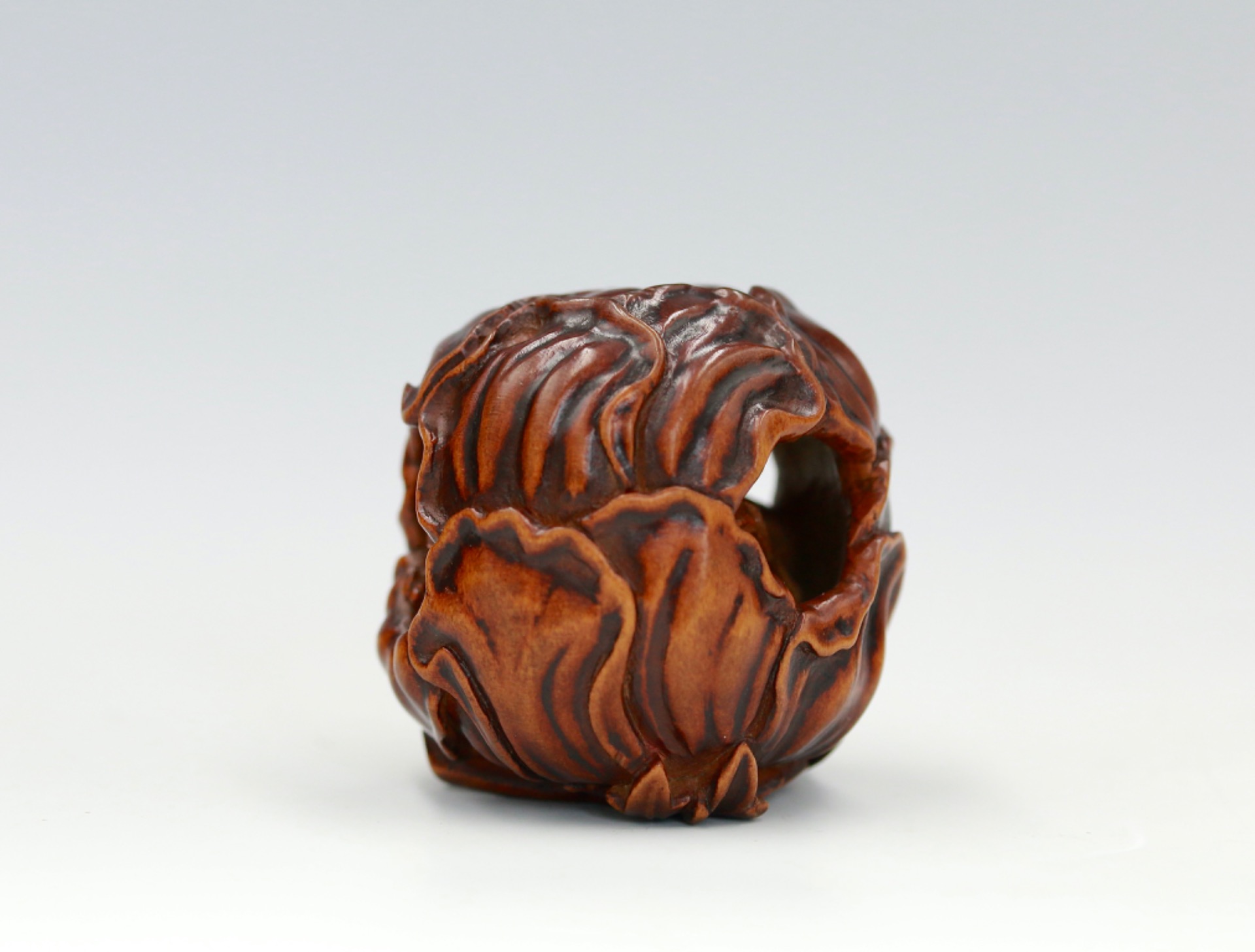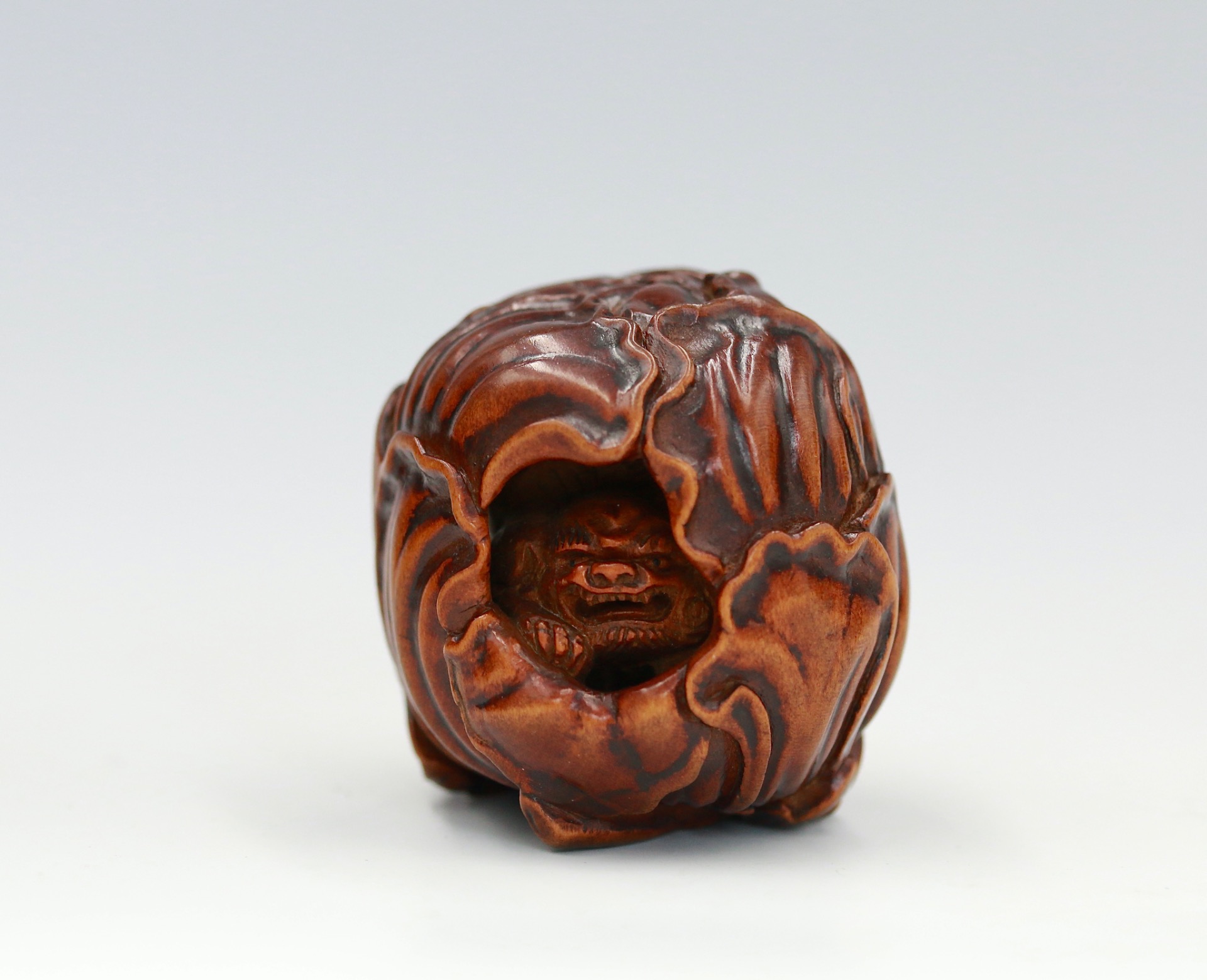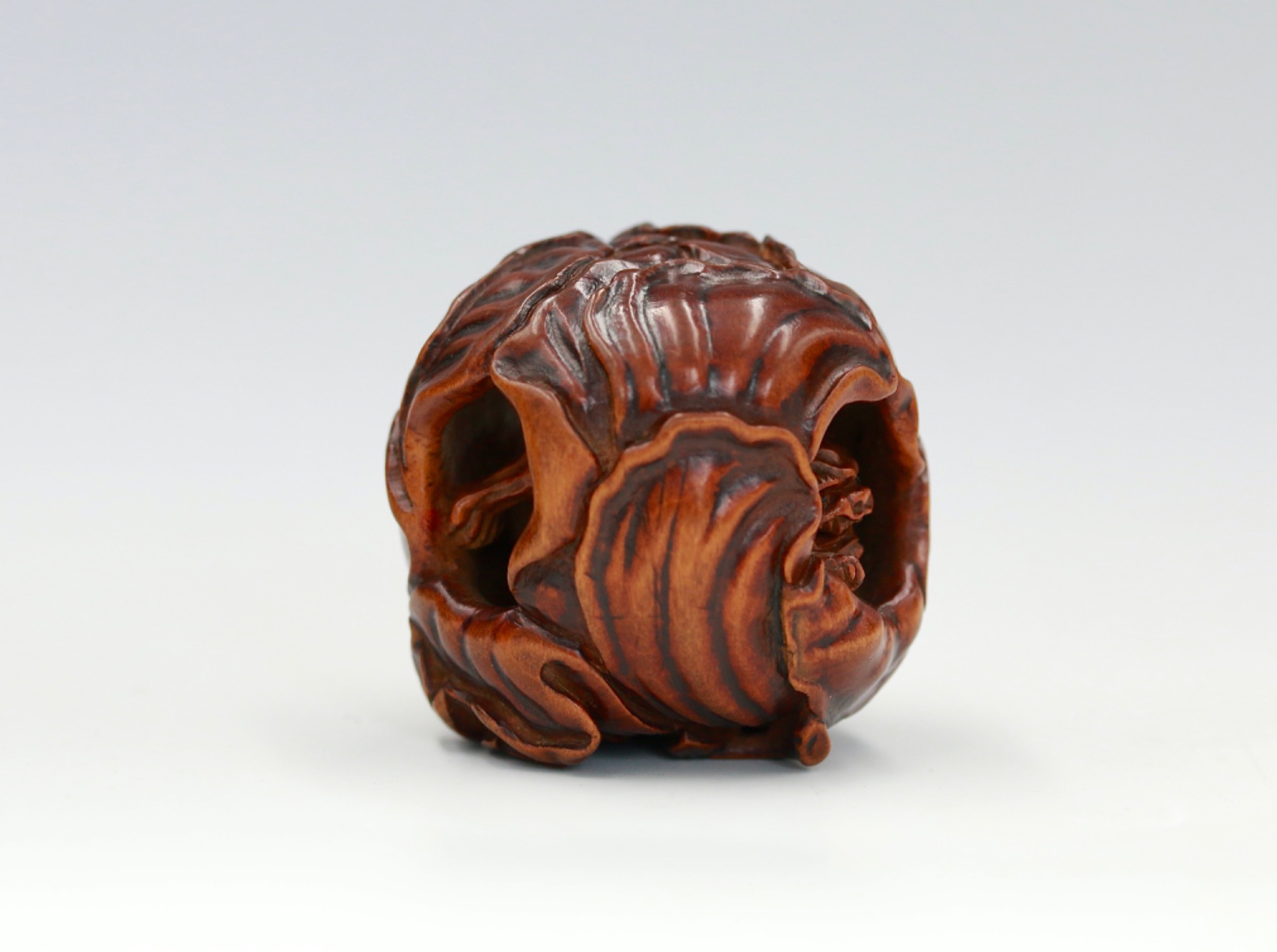 This is a clever interpretation of the Shishi and peony design. This version, the Shishi is completely enveloped by the blossom. Carved from a single piece of material, this example is a 'real' anabori netsuke.