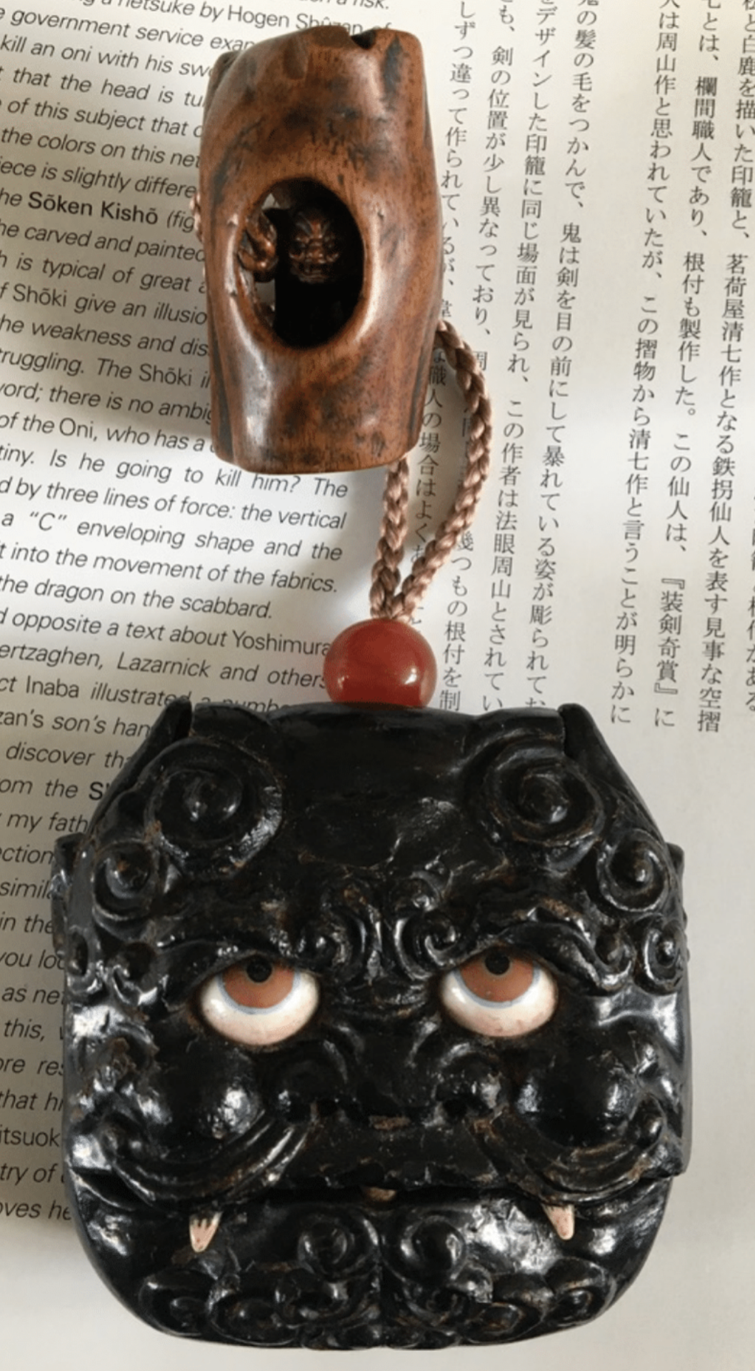 Please compare to another anabori design - an Oni in a tree stump. This example I owned some years ago, a very similar example is recorded by Ryukei (studio).