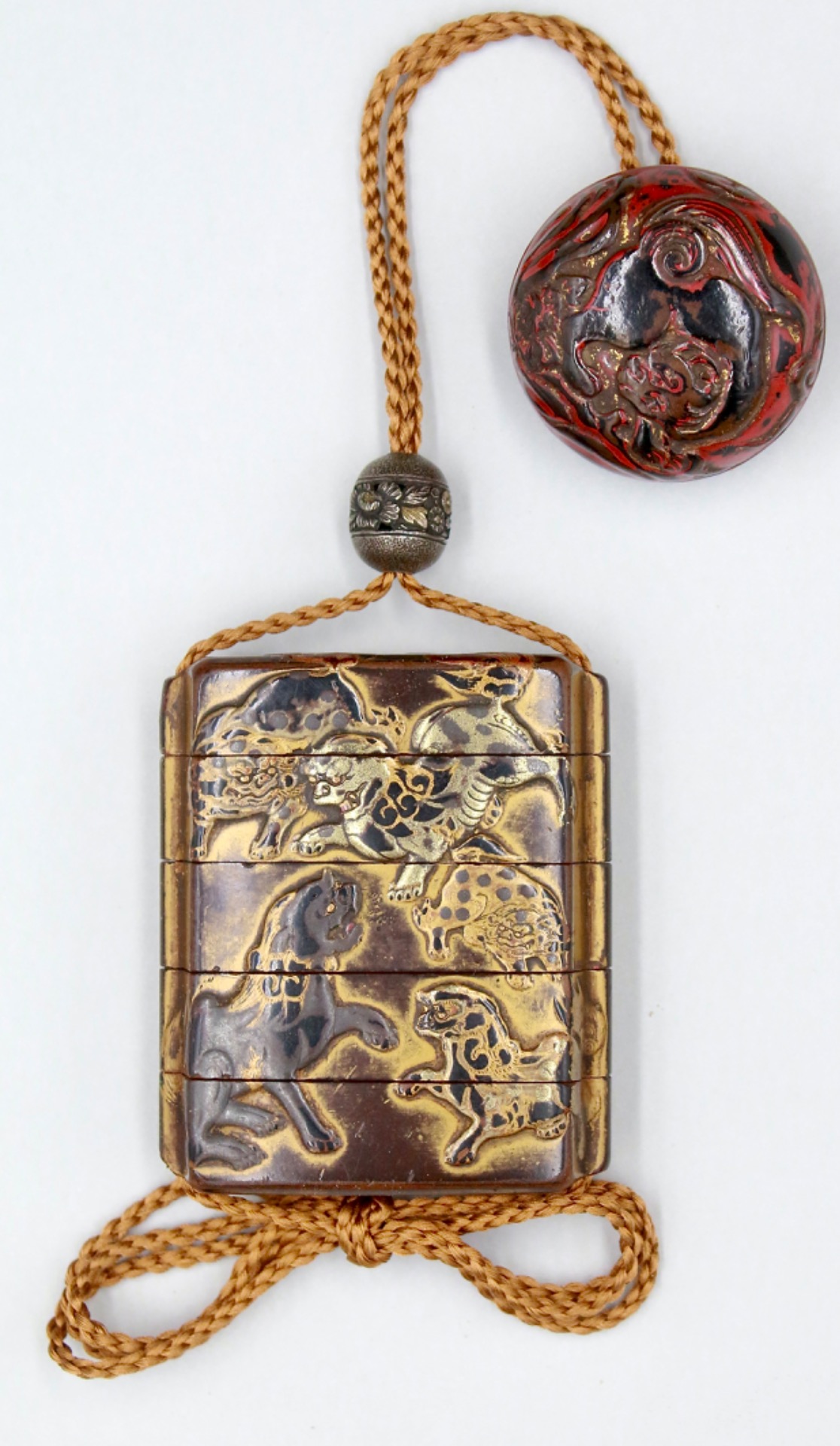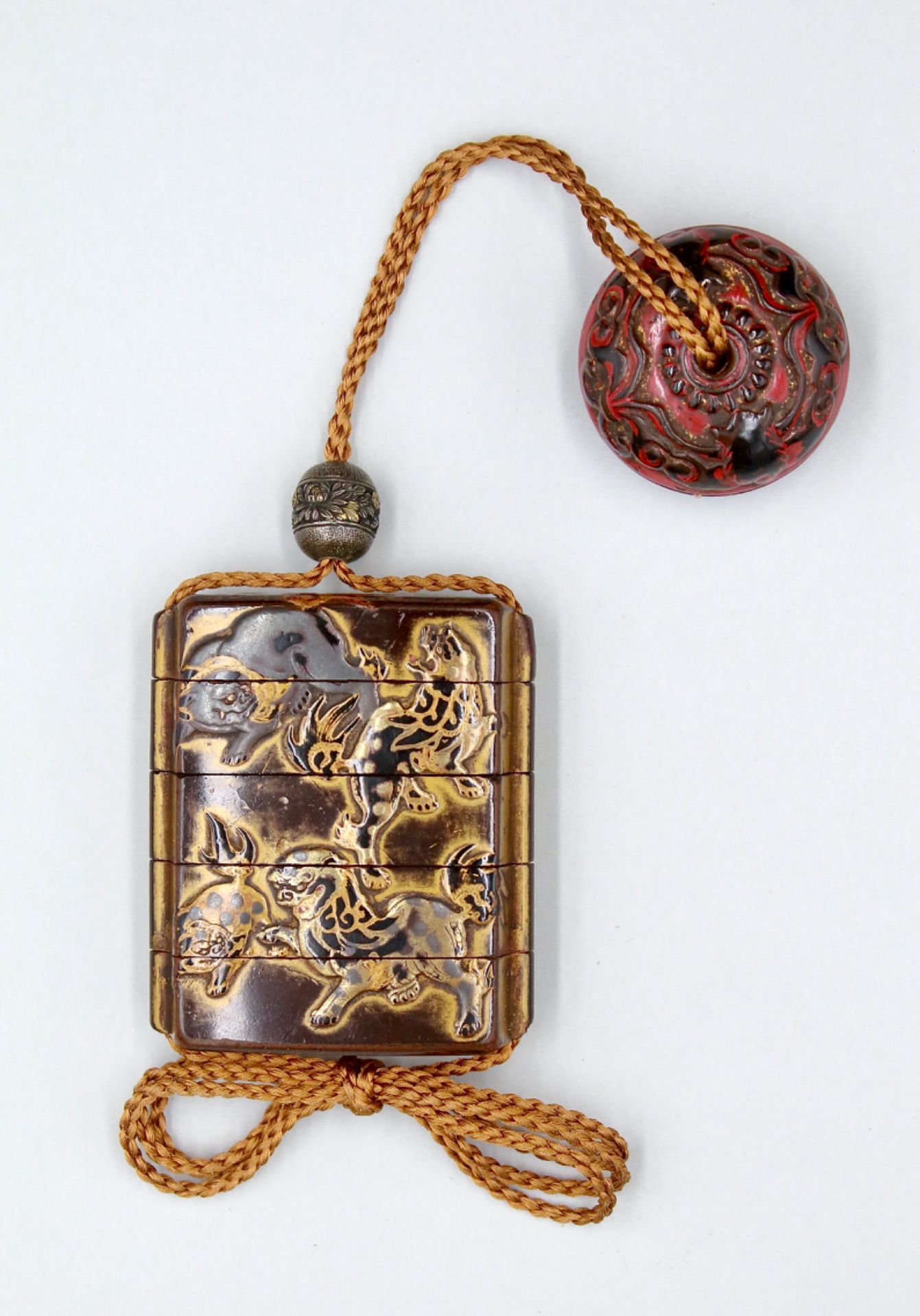 Metal ojime (Chrysanthemum design) and cord included. We have paired the Inro with a suitable period Shishi manju, though this is not included. Purchase can be negotiated separately, please see link for item.