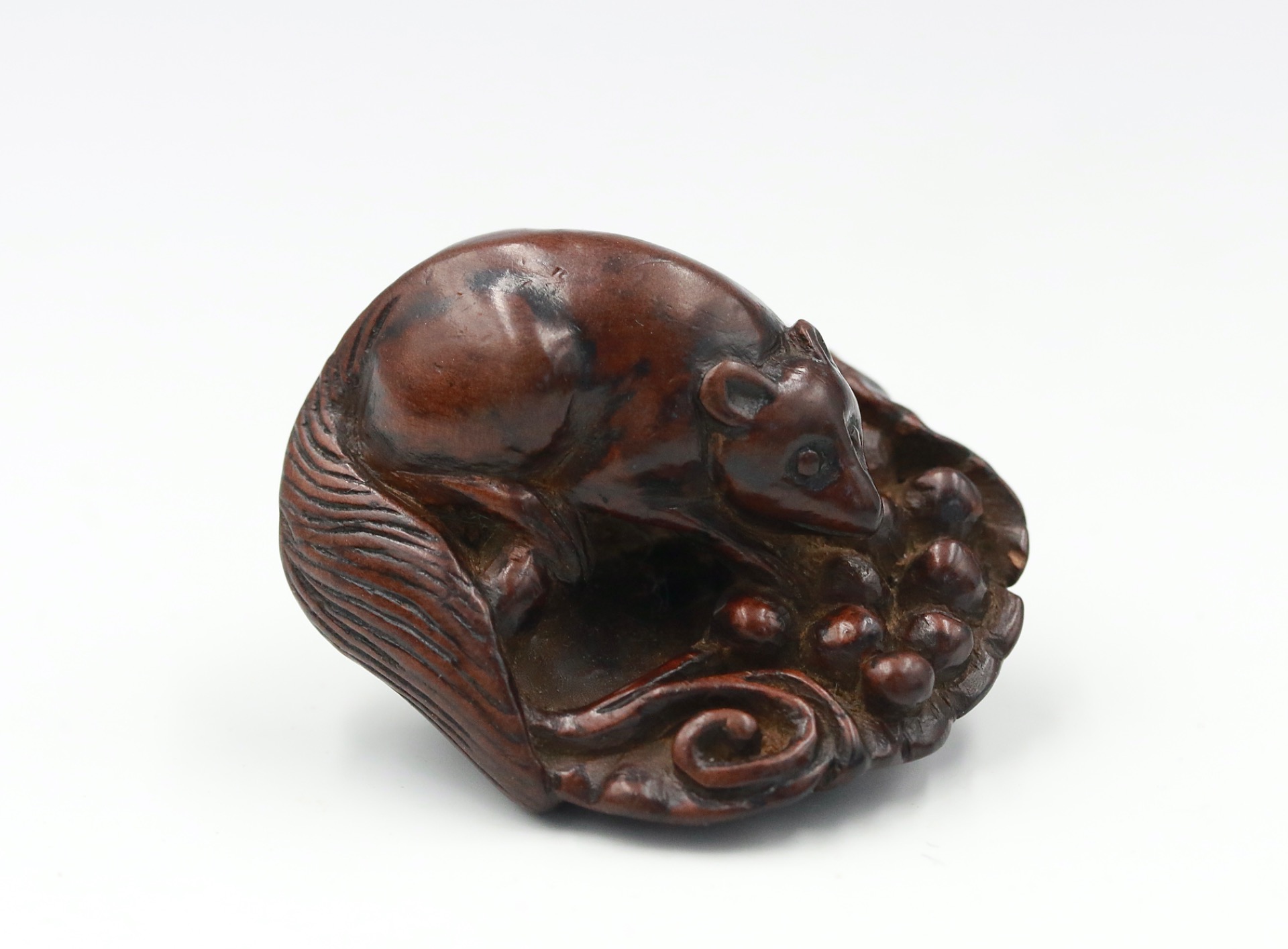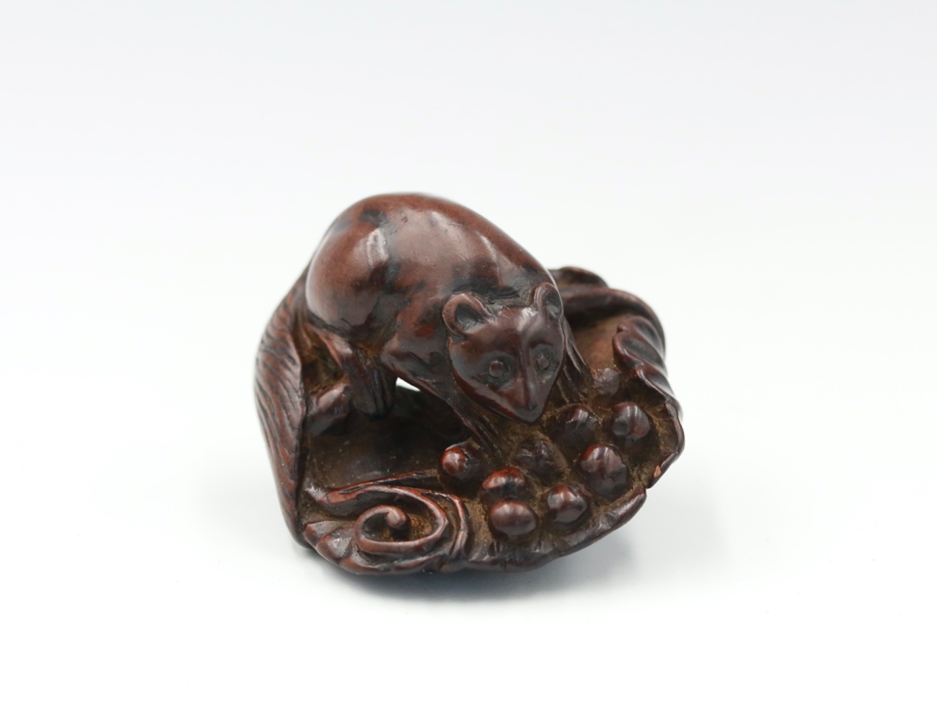 A wood netsuke of a Squirrel and vine by Tametaka (為隆).