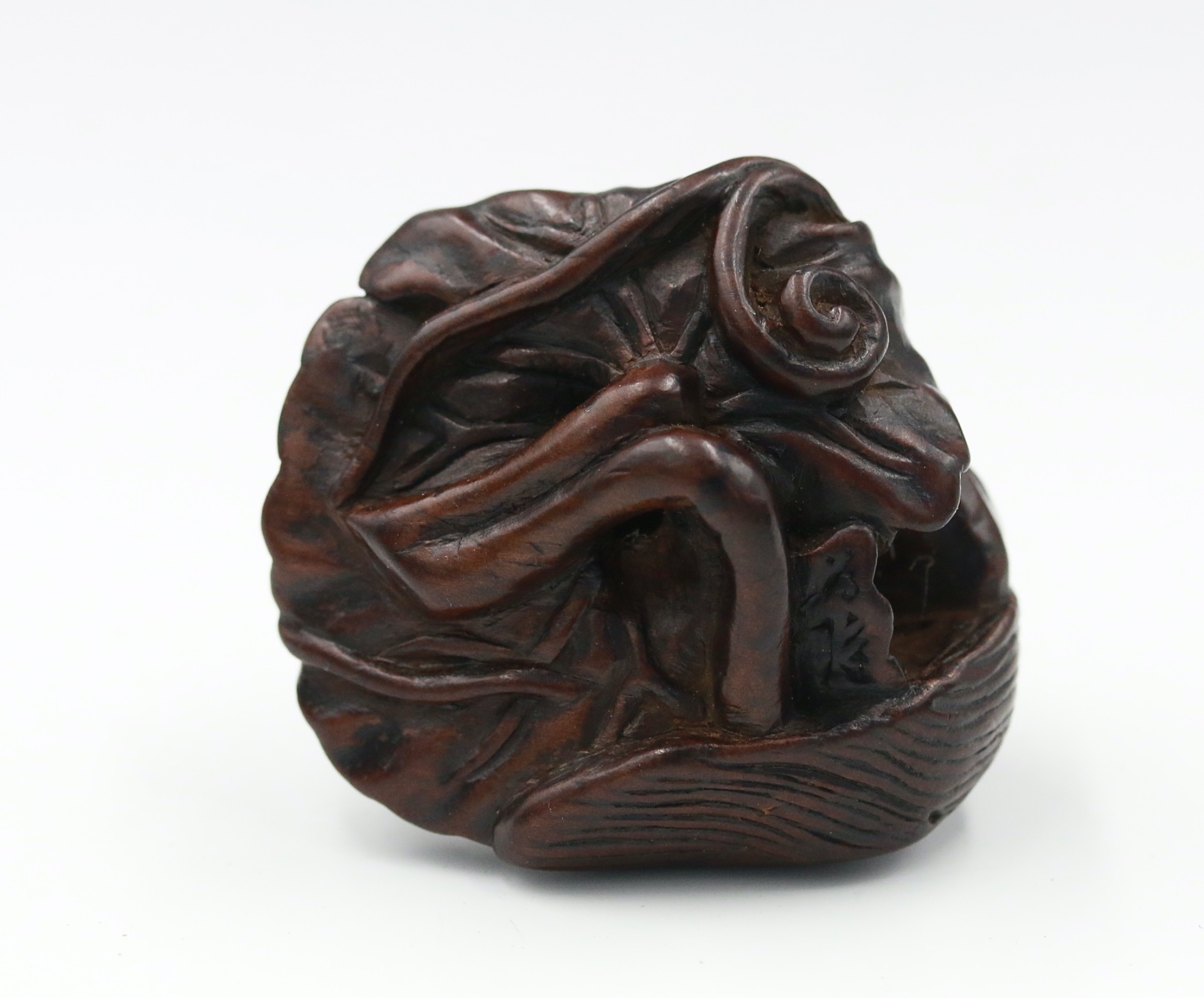 Likely a representation from the artist's early career and to my knowledge it is the only example of its type. As Tametaka developed, so too did the vogue for zodiac netsuke in Japan which Tametaka specialised in satisfying for a large portion of his career. A detail shared with me from a Japanese enthusiast and researcher is that the artist died in 1794 and many of the netsuke that demonstrate the etched chomei are from his earlier career, whereas netsuke bearing the ukibori variety of signing were from his very last years of production when he had established a "school". This information appears to be supported by surveying and evaluating netsuke signed with the name Tametaka.