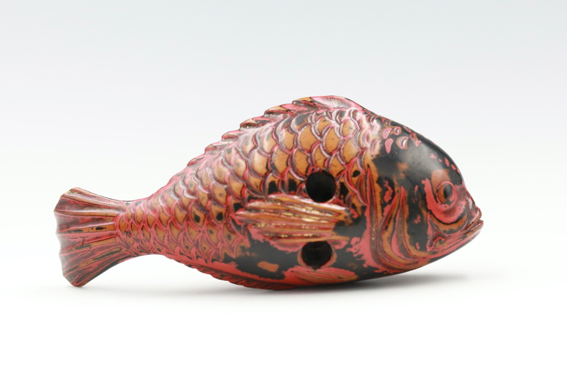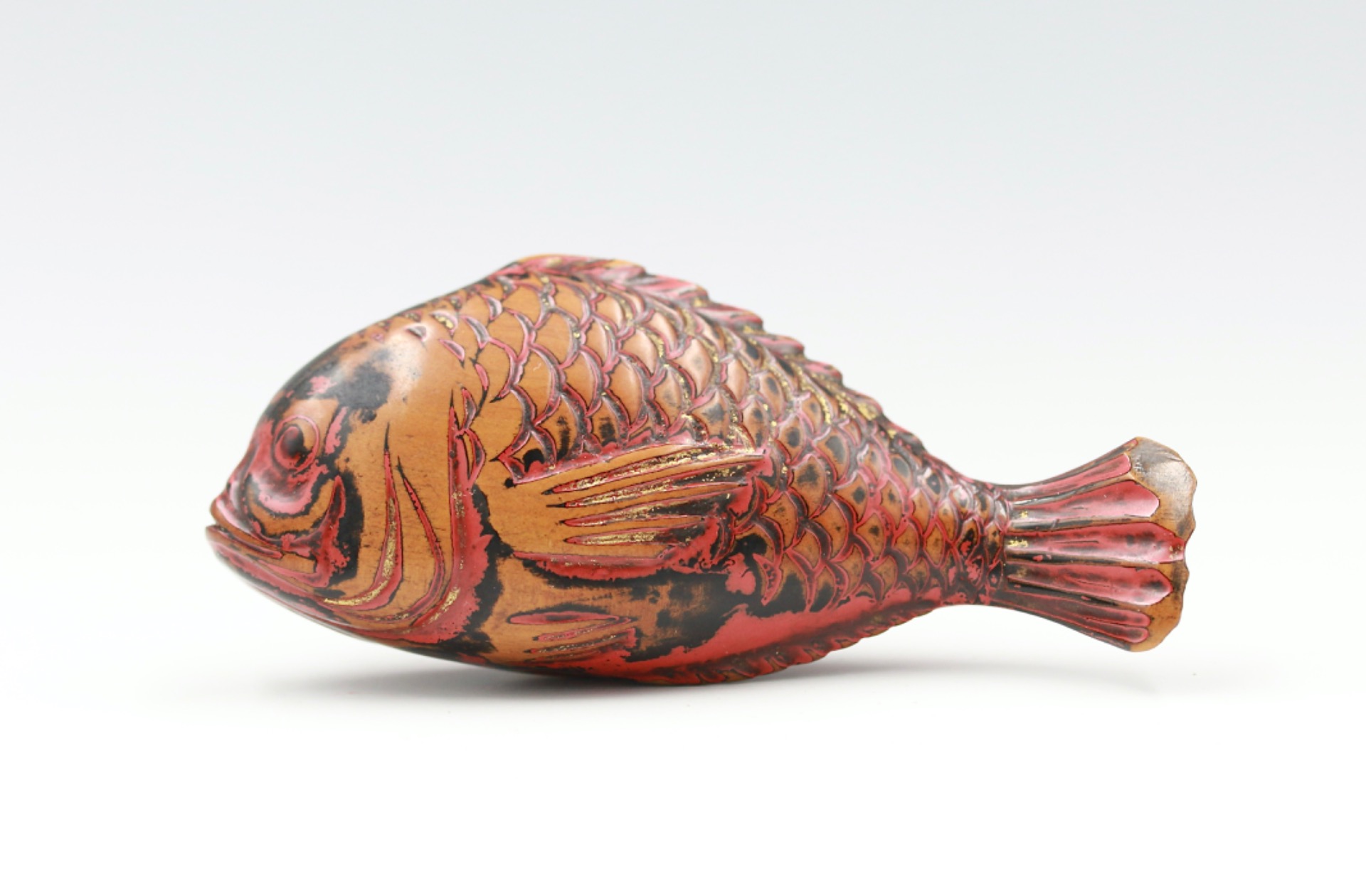 Boldly carved, treated with Negoro-nuri, with remnants of gold highlights.