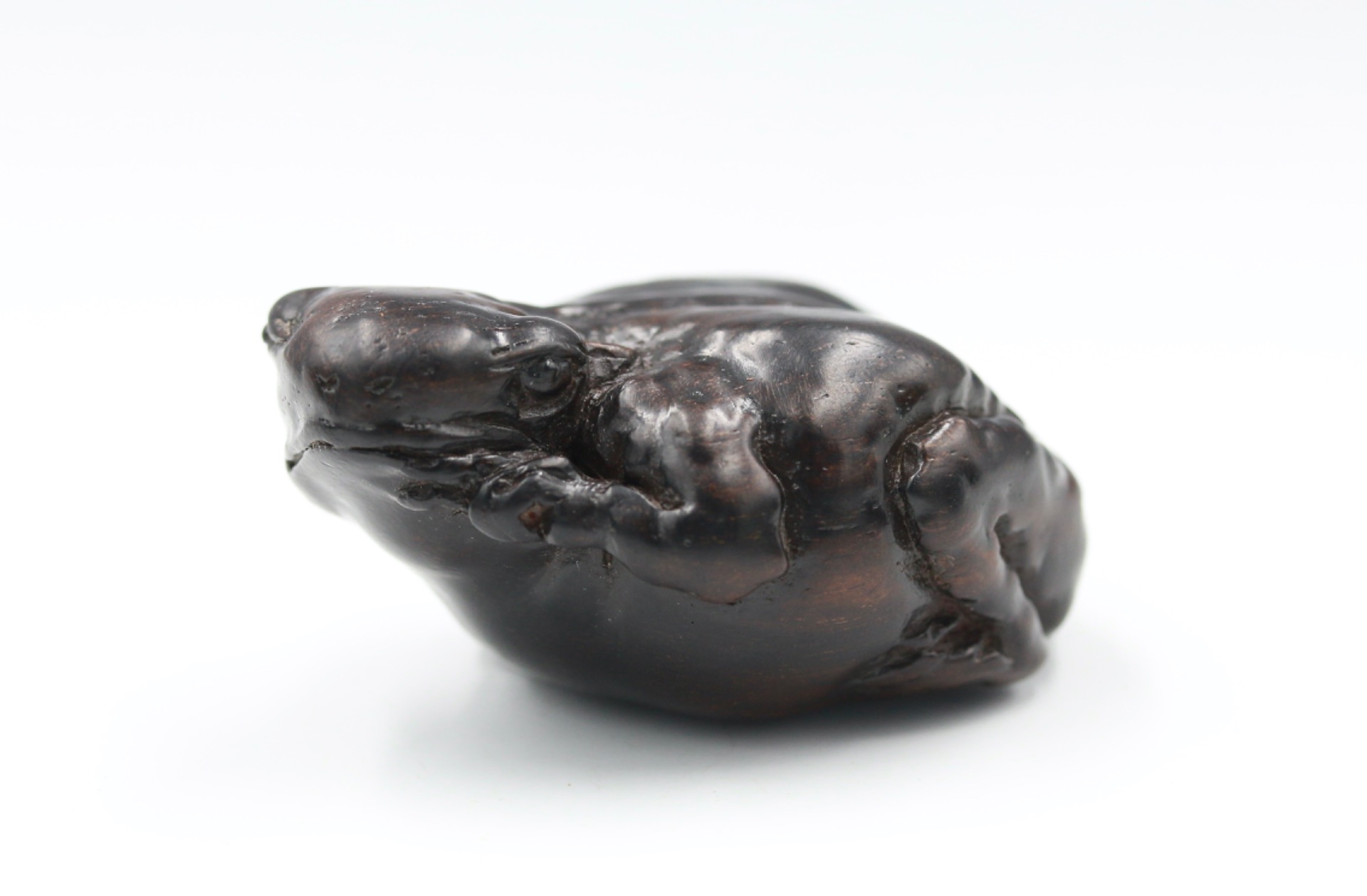 The creator of our toad was a master of capturing the moment and captured the toad at the point immediately preceding placing a morsel of food in its mouth. The toad has swivelled its head towards its hand at the same time as bringing its hand towards its mouth, hastening the feed.
