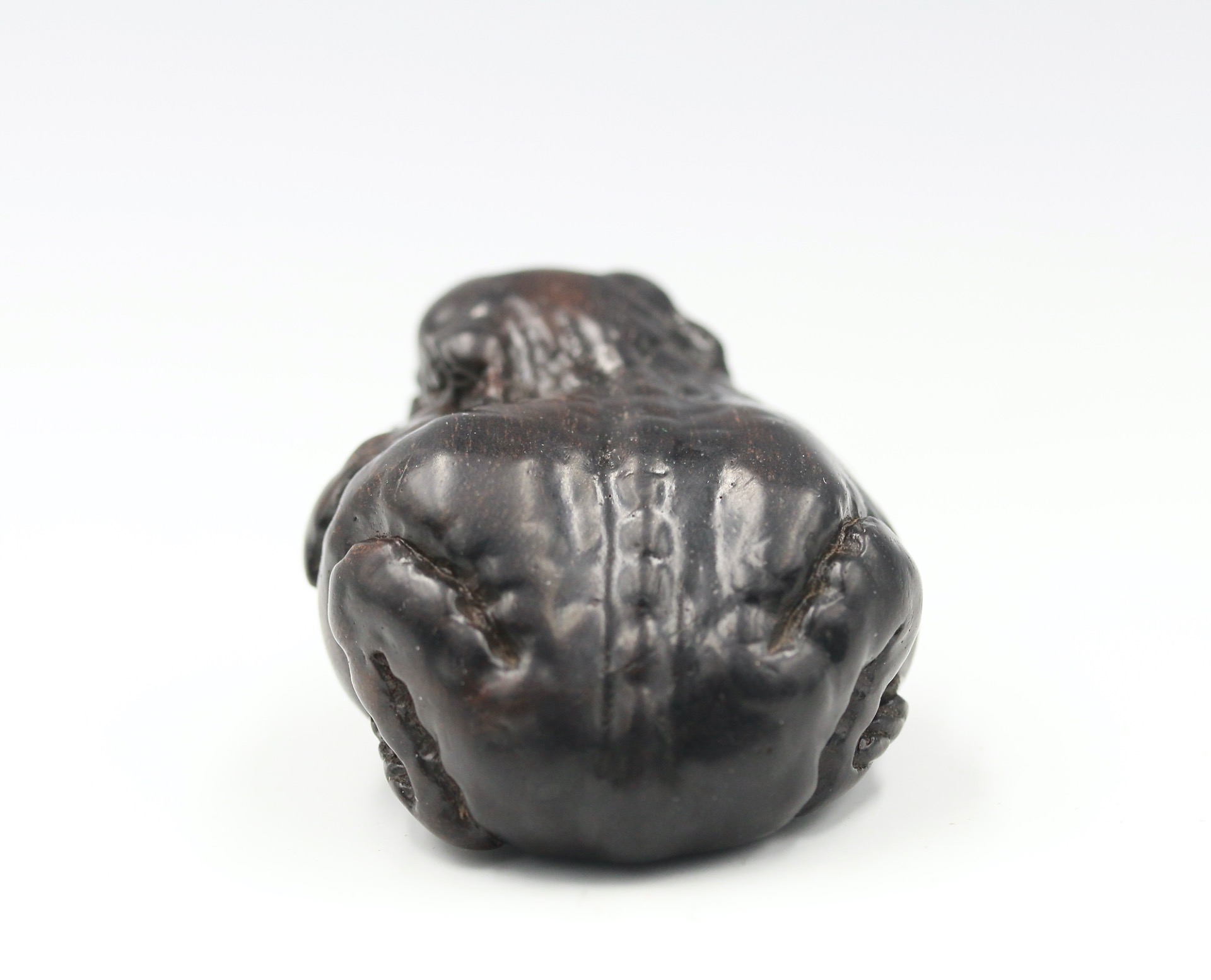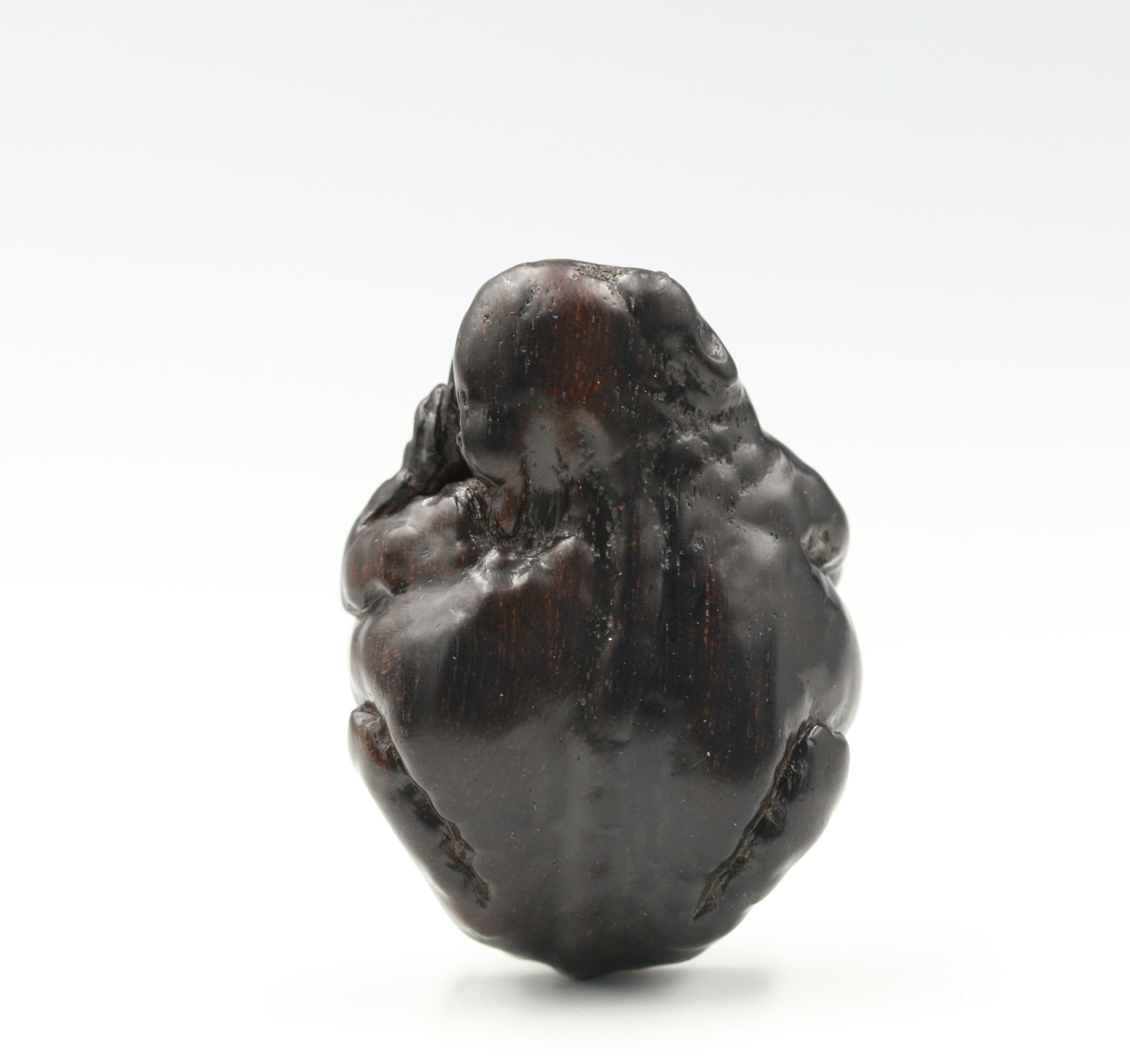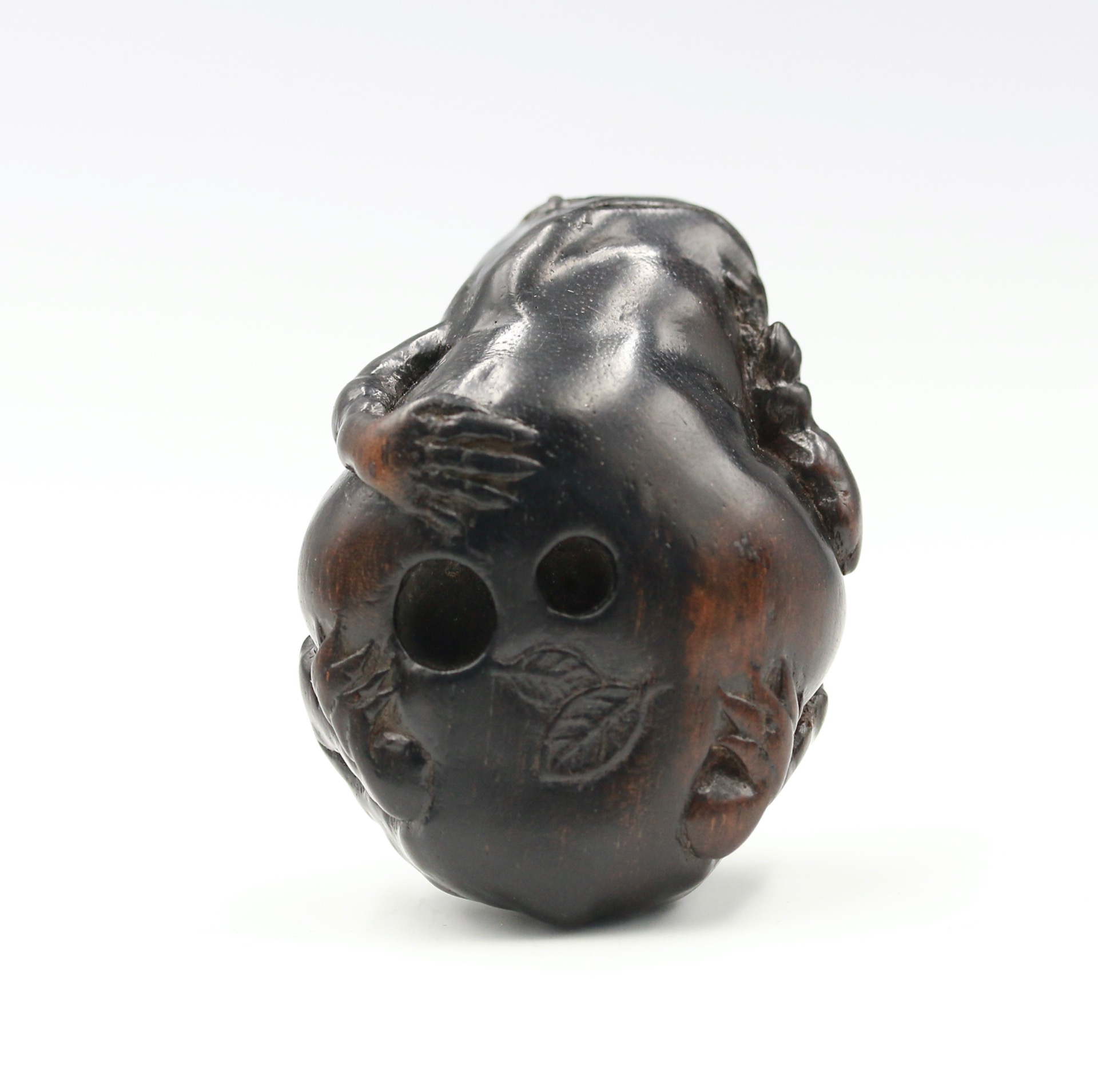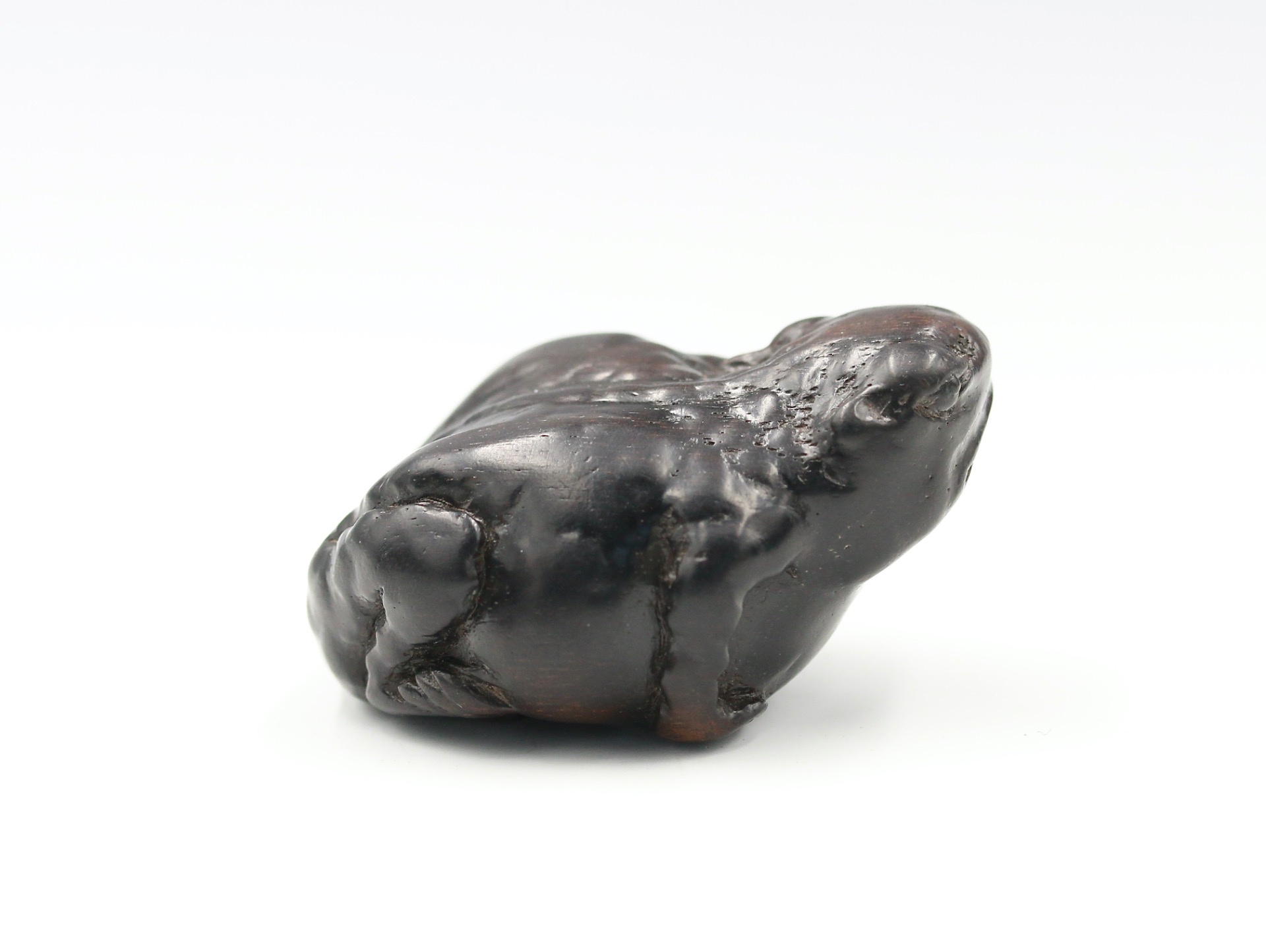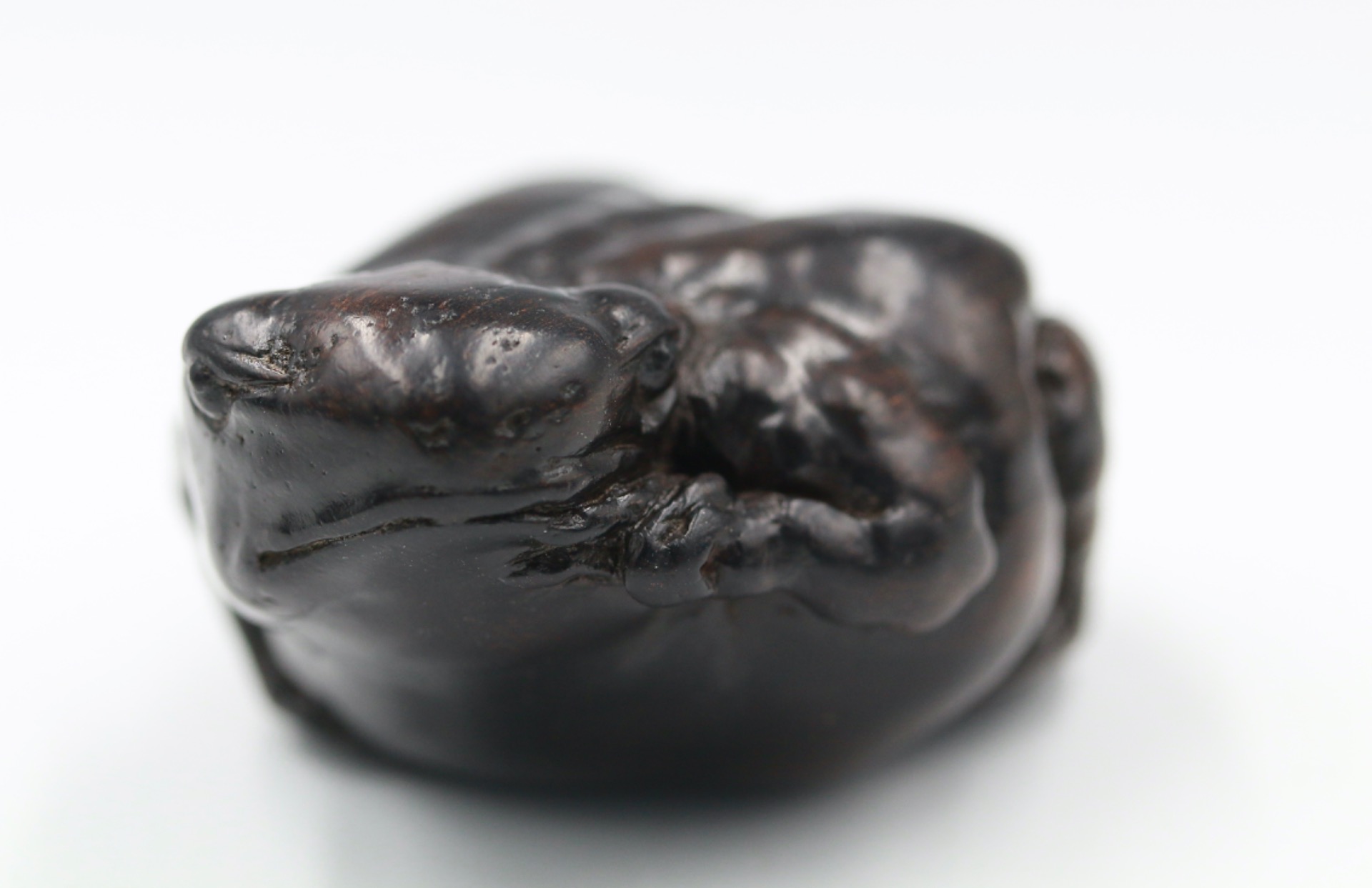 The two little leaves found on the underside at one time housed a signature. That signature was subsequently removed as its presence was deemed spurious. Whether that was the correct action is debatable. A modern netsuke-shi did attest that the overall conception was what one would expect from the artist/studio synonymous with the signature originally found on the netsuke.
