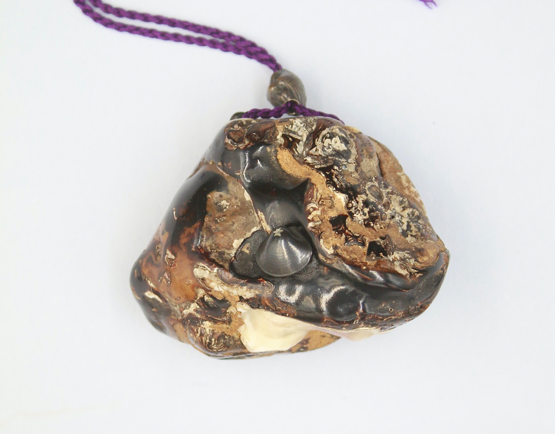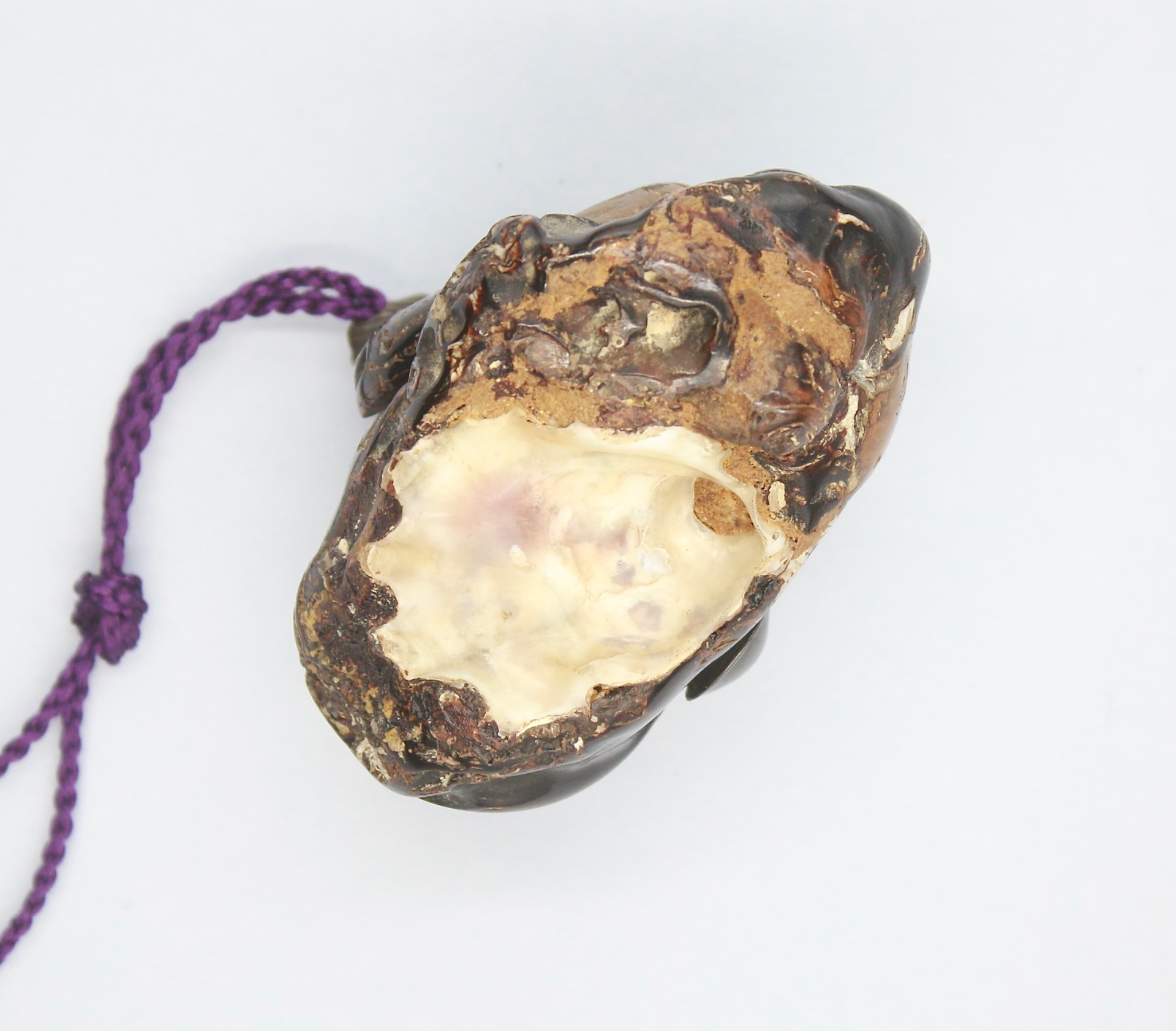 An umimatsu Tonkotsu, with hinged door. Applied to the box is a shakudo clam, which has a starfish in silver also applied.